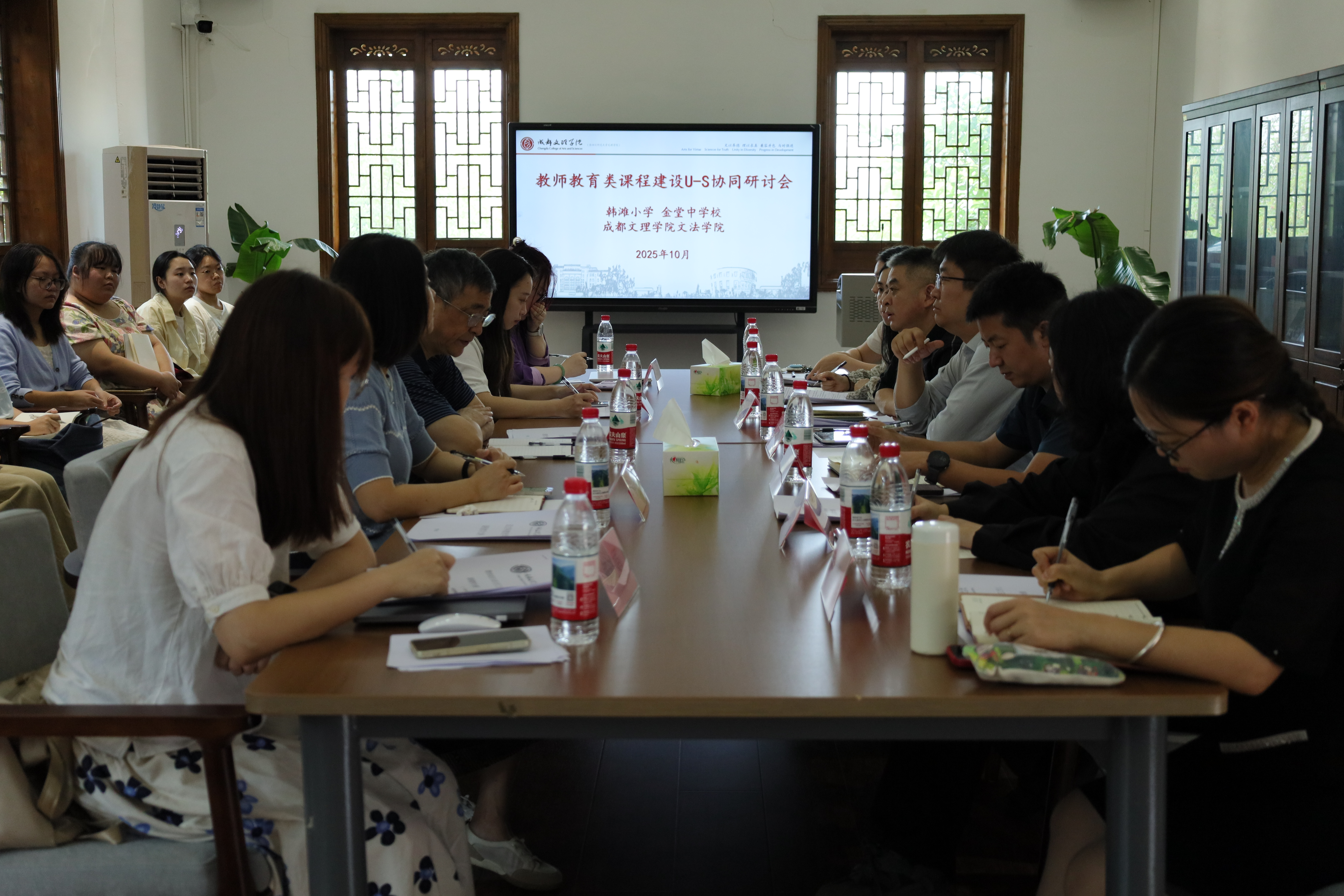 10月9日上午,文法学院在弘博书院举行教师教育类课程建设U-S(高校-中小学)协同研讨会。会议聚焦师范专业内涵提升与课程实践融合,邀请金堂县韩滩小学晏富荣校长、语文教研组长张春丽老师、优秀班主任李玲霞老师,四川省金堂中学校王飞鹏副校长、教务处黄勇主任、语文教研组长周甜老师,青白江区教培中心曾芮老师参会;文法学院院长徐学东教授、副院长曹佳丽教授、学院教师教育类课程教师代表、汉语言文学(师范)专业优秀学生代表共同出席,搭建校地协同育人对话平台。