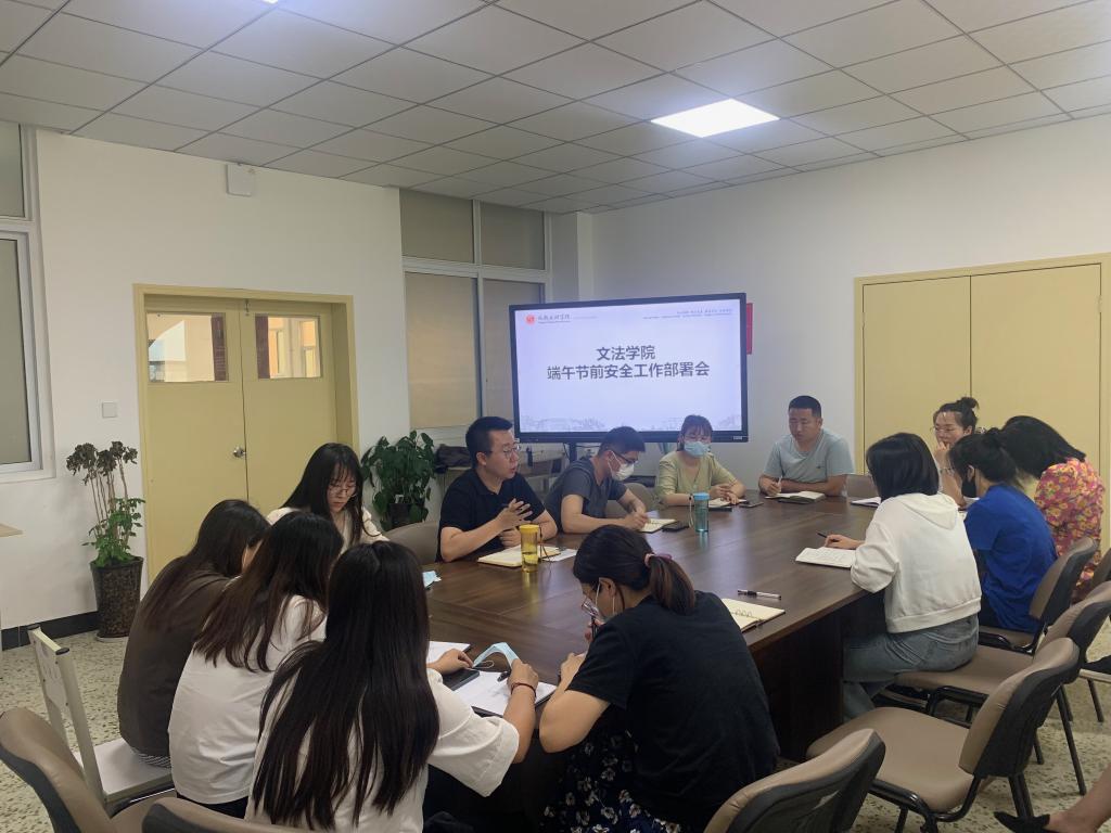 月日下午时文法学院于行政楼召开端午节前安全工作部署会。文法学院党总支副书记兼学工办主任李明昌及全体辅导员参与会议会议由李