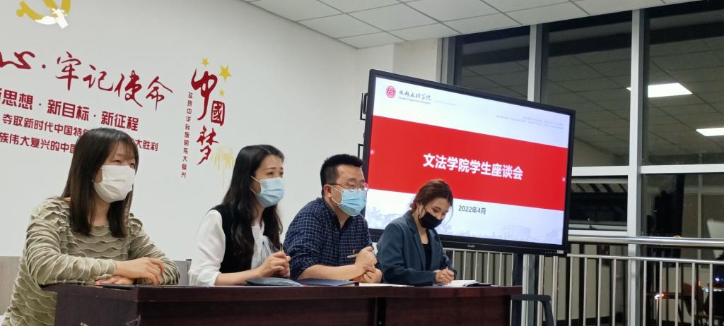 月日晚时文法学院于行政楼召开四月学生座谈会。文法学院党总支副书记兼学工办主任李明昌、学生党支部书记丁兰、学生党支部书记任