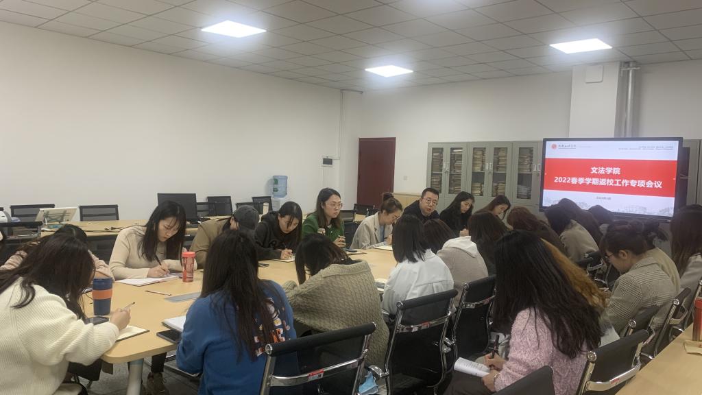年月日下午文法学院学生工作办公室于行政楼召开春季学期返校工作专项会议。党总支书记陆明烨、党总支副书记兼学工办主任李明昌全