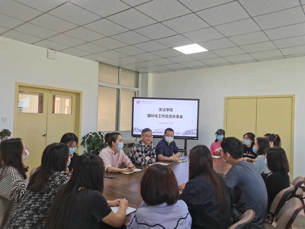 月日上午文法学院在行政楼开展国际化工作分享交流会。文法学院院长徐学东、党总支书记陆明烨、党总支副书记李明昌及全体辅导员参
