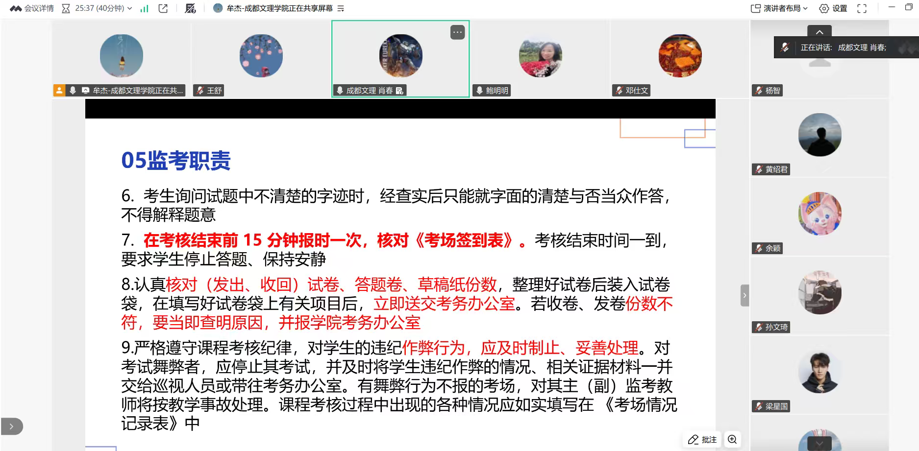语文教育教研室通过线上会议平台召开期末工作专项部署会,全体教研室教师参会,从监考纪律、试卷核查、评卷规范到成绩录入等环节
