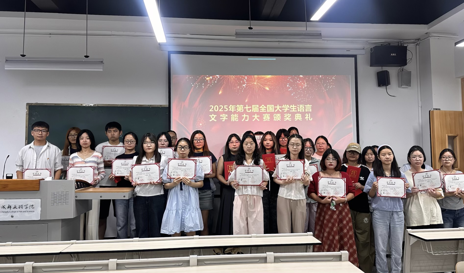 第七届全国大学生语言文字能力大赛颁奖仪式在B101教室隆重举行,指导教师代表与全体获奖学生齐聚现场,奖项分为一、二、三等