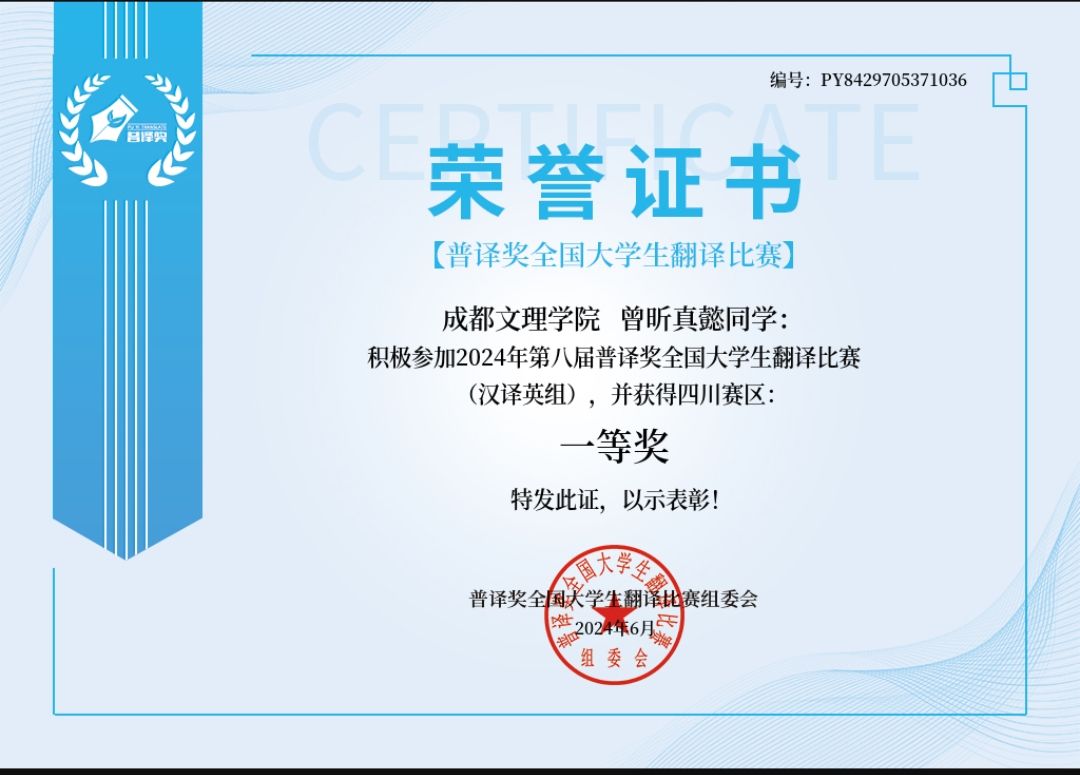 文法学院学子在2024年全国第八届普译奖四川赛区比赛中喜获佳绩