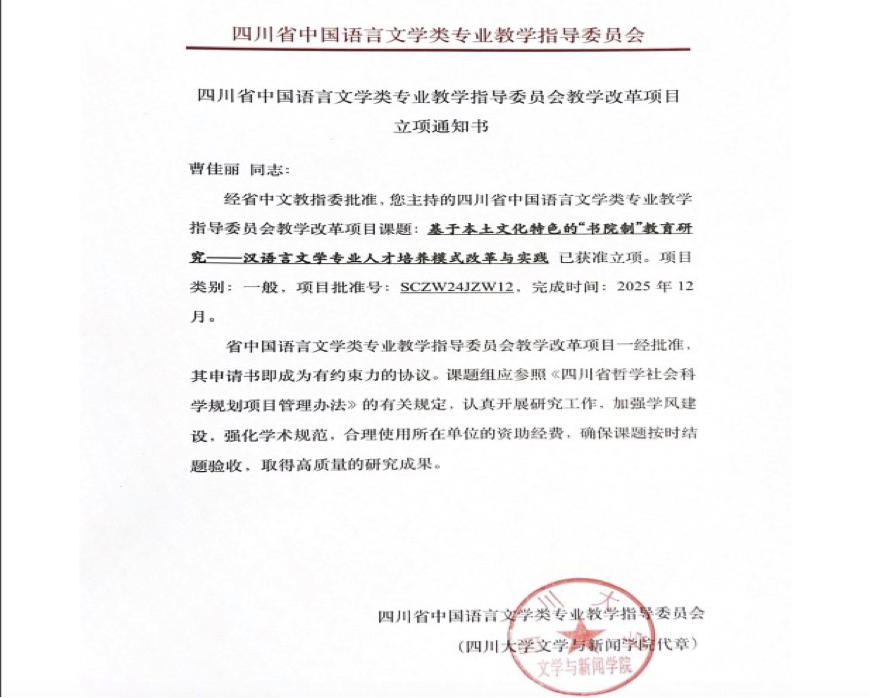 年月日四川省中国语言文学类专业教学指导委员会公布年教学改革项目立项名单我院曹佳丽教授、谢荣萍副教授、陈诗副教授、蒋瑜副教