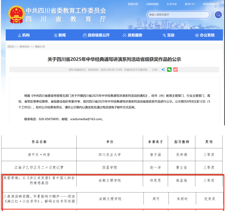 由省委宣传部、省委教育工委、教育厅、省文明办、省语委组织开展四川省2025年中华经典诵写讲演系列活动省级获奖作品名单公示
