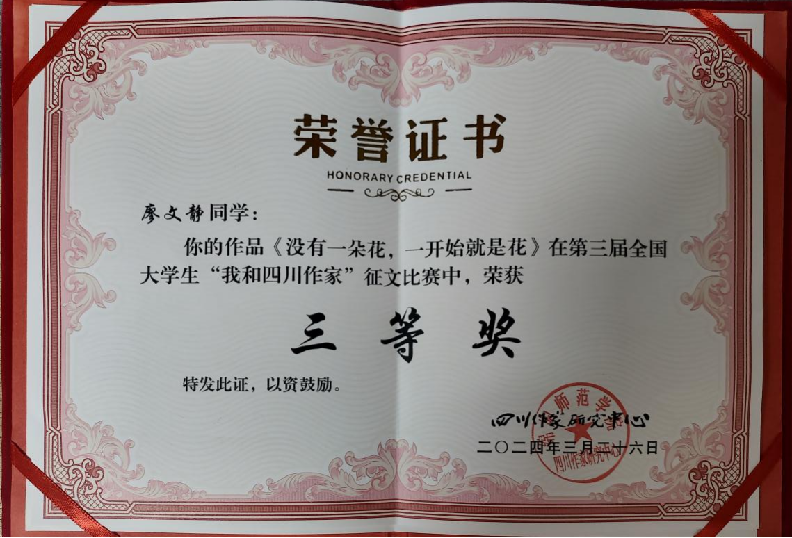 近日第三届全国大学生我和四川作家征文大赛获奖名单揭晓一等奖一名二等奖三名三等奖六名。文法学院级汉语言文学专业的廖文静同学