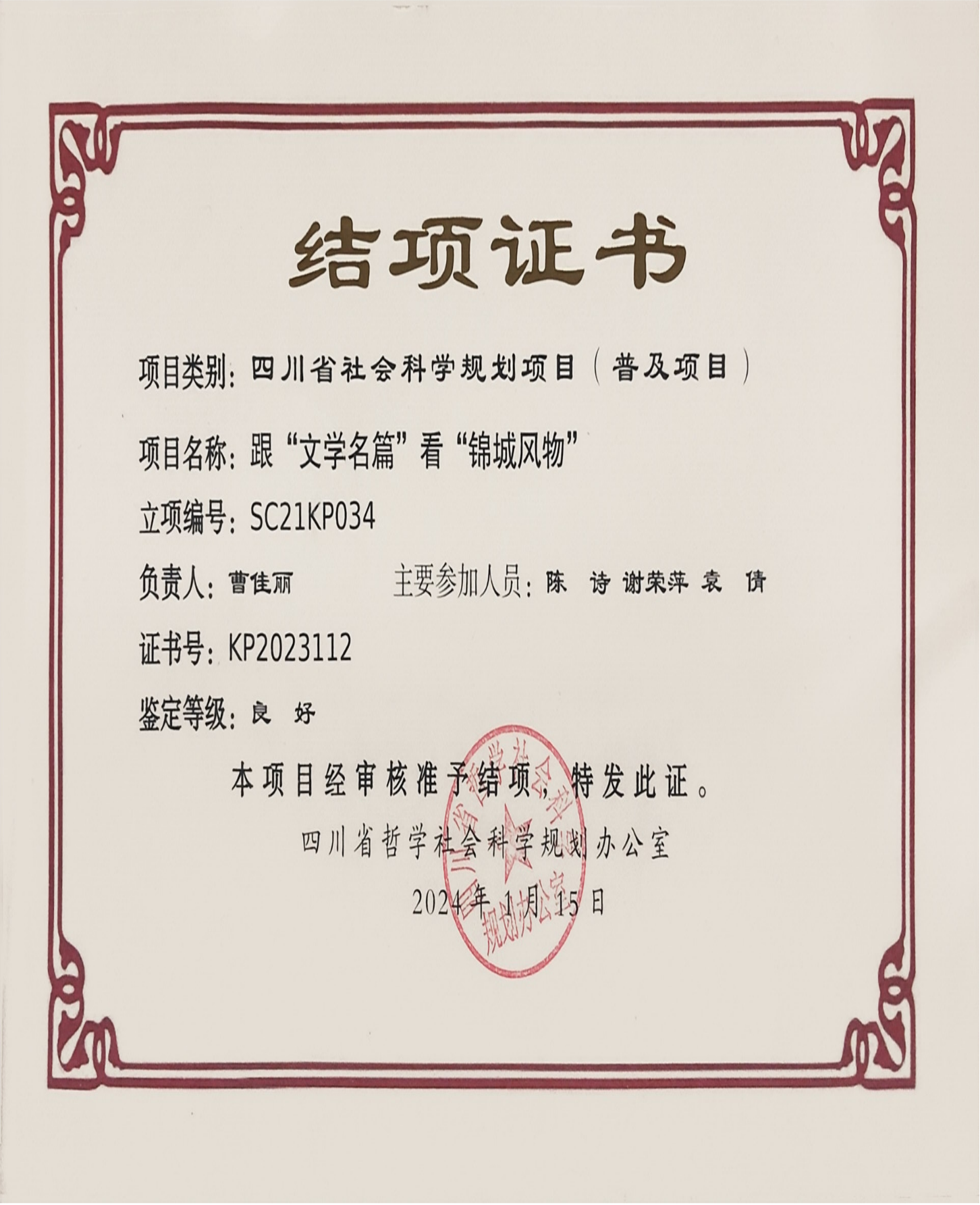 近日由文法学院曹佳丽教授主持的四川省社会科学规划项目普及项目跟文学名篇看锦城风物经过四川省哲学社会科学院规划办公室的审核