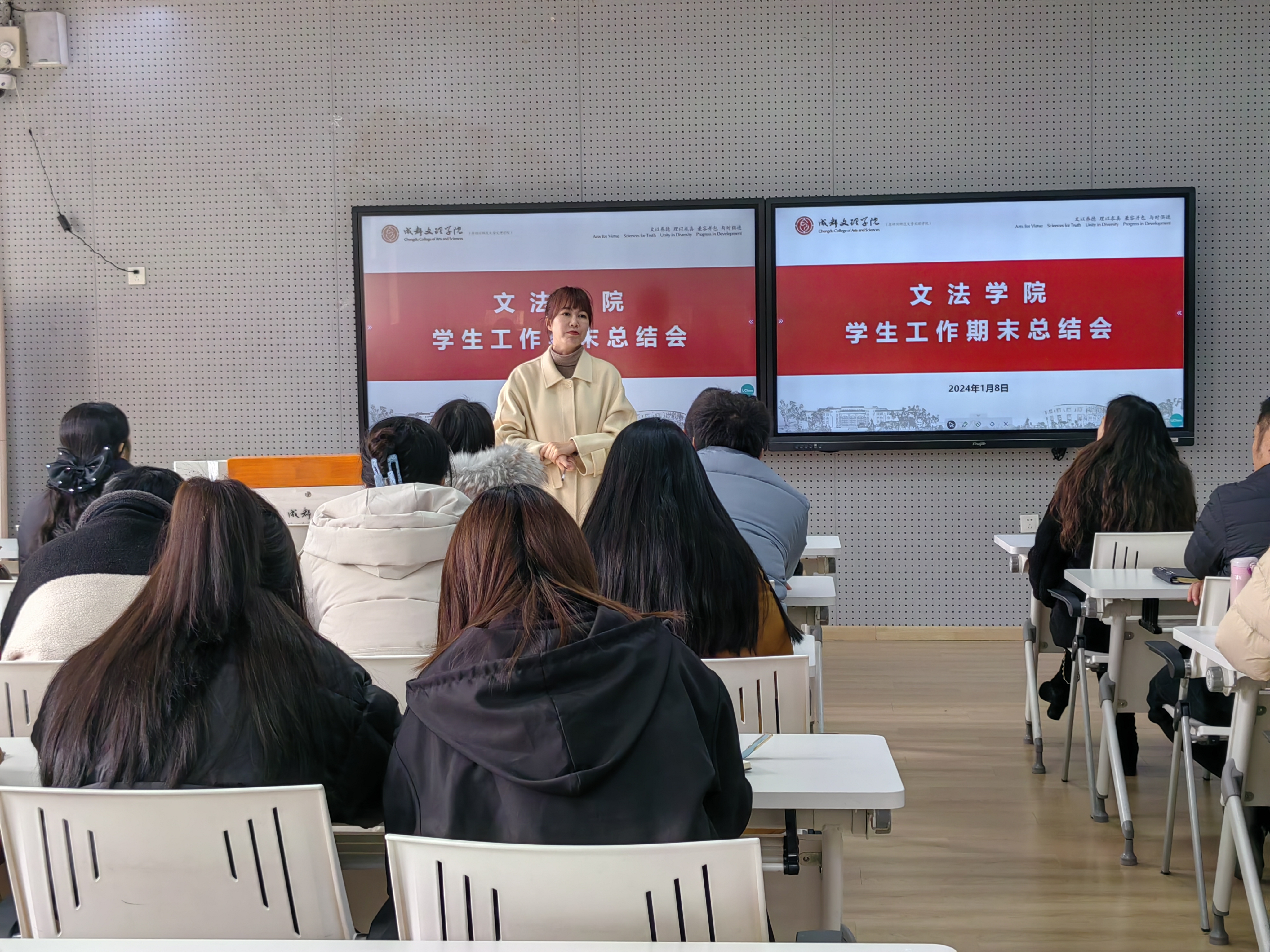 月日下午文法学院在教学楼召开年度学生工作总结会议。文法学院党总支书记陆明烨、党总支副书记兼学工办主任李明昌及全体辅导员参