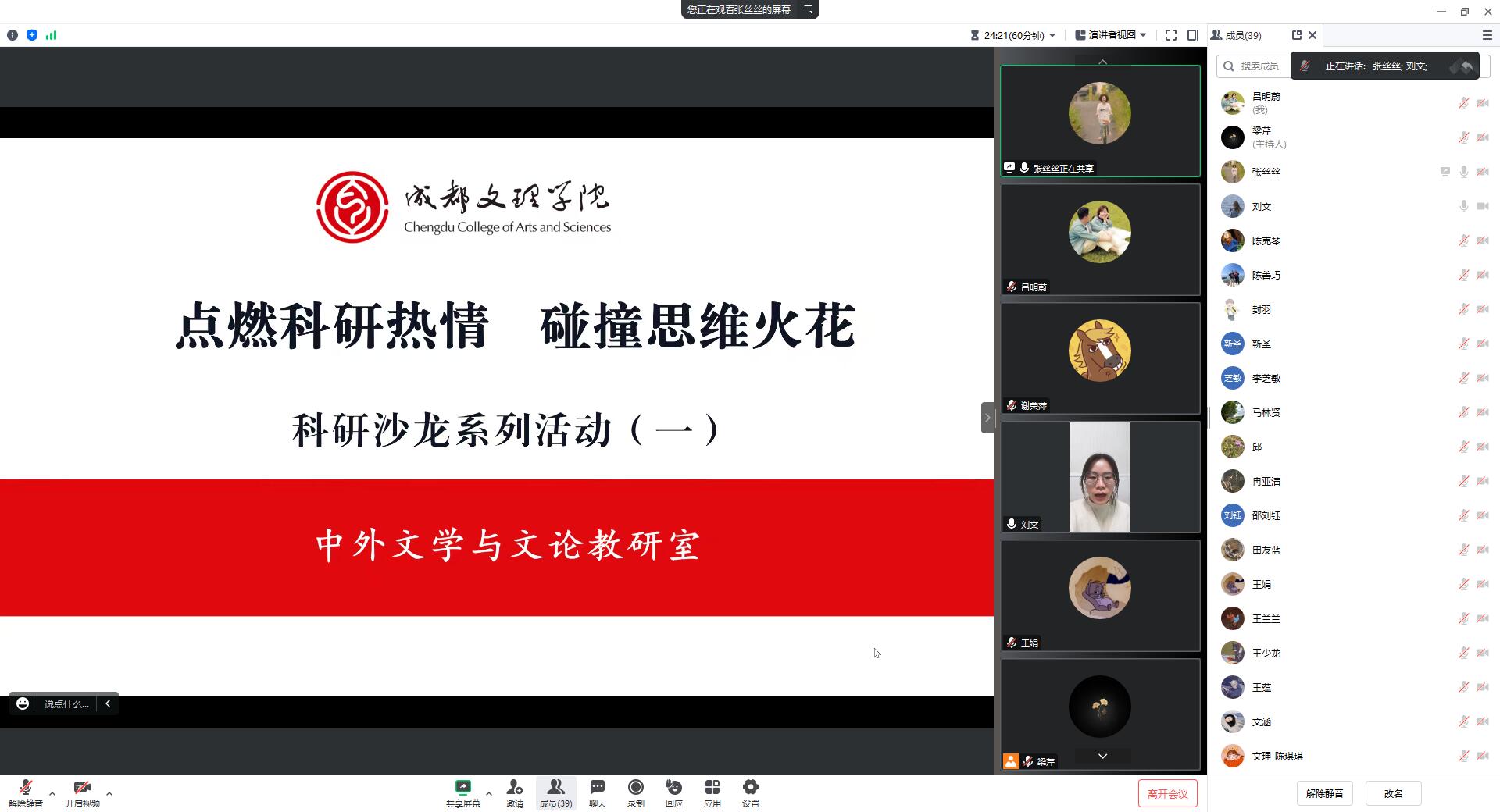 近期成都文理学院文法学院中外文学与文论教研室积极响应学校、学院有关精神召开了两次科研沙龙系列活动为教研室的教师们提供了深