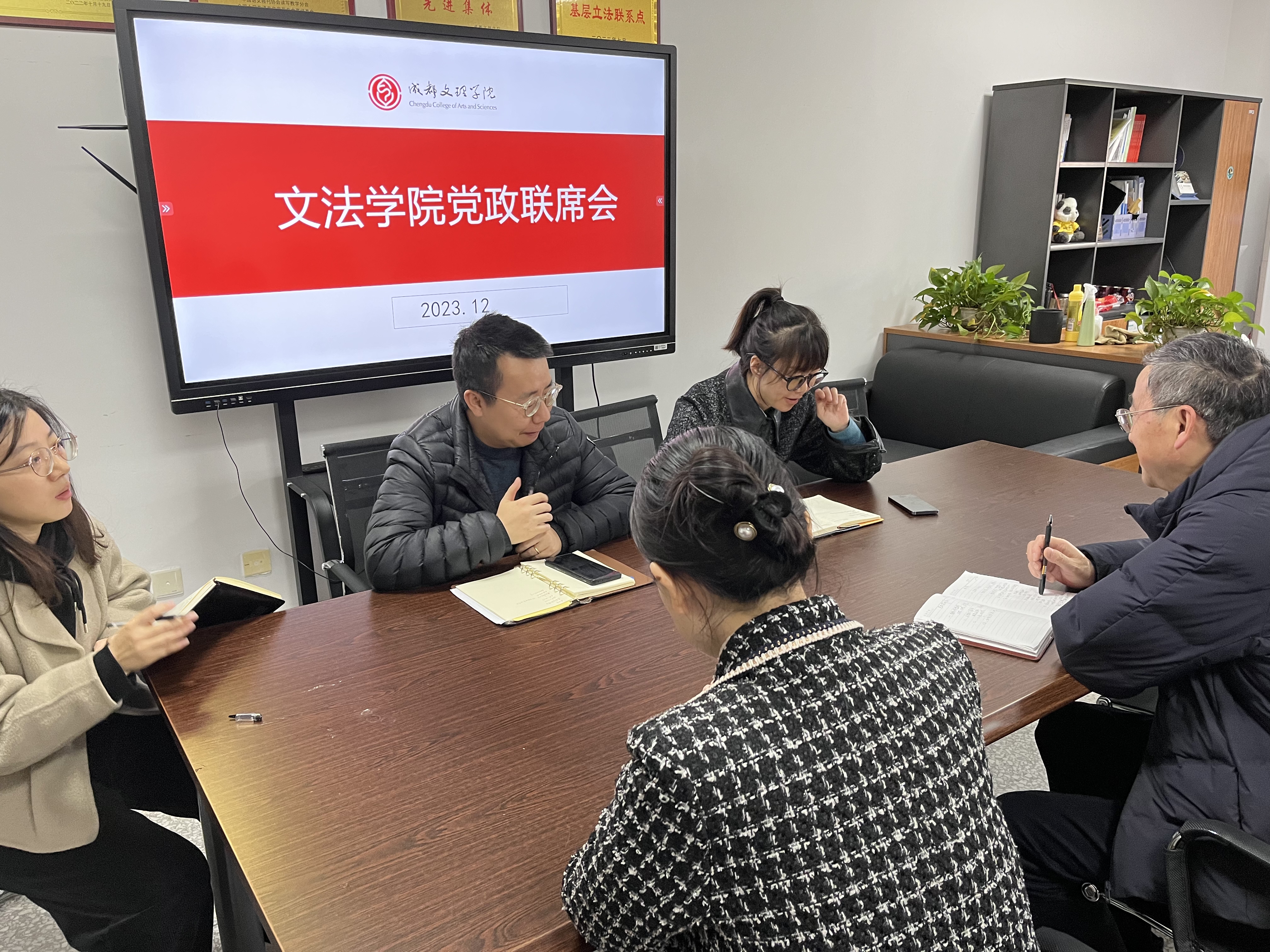 月日文法学院在行政楼办公室召开党政联席会议。院长徐学东、党总支书记陆明烨、副院长曹佳丽、党总支副书记李明昌参加会议。会议
