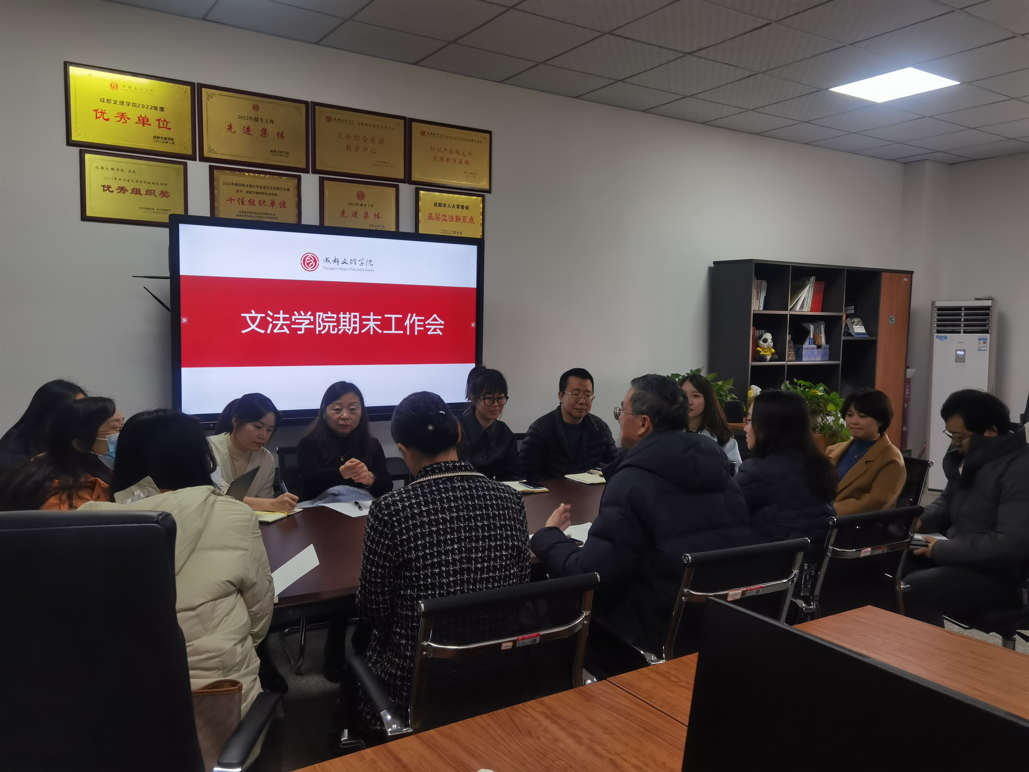 月日文法学院在行政楼办公室召开期末工作会。院长徐学东、党总支书记陆明烨、副院长曹佳丽、党总支副书记李明昌及各教研室正副主