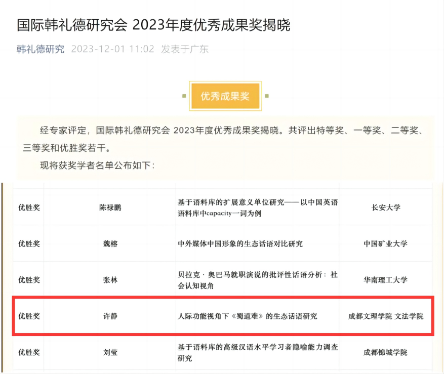 文法学院教师许静荣获“韩礼德国际研究会”优秀学术成果奖