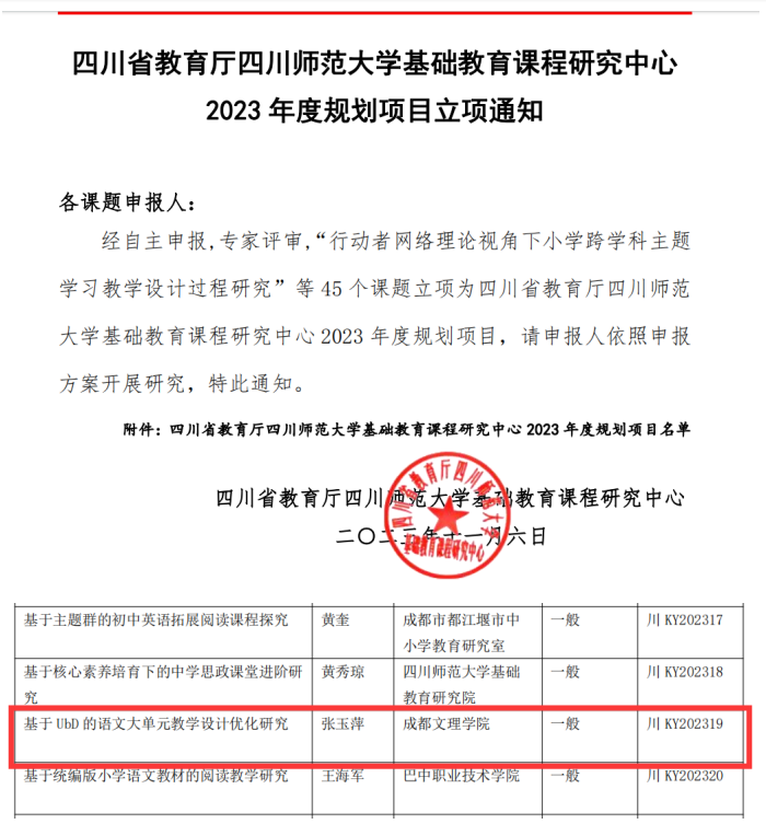月日四川省教育厅四川师范大学基础教育课程研究中心公布了年度规划项目。据悉此次共有项课题立项文法学院张玉萍老师主持的课题基