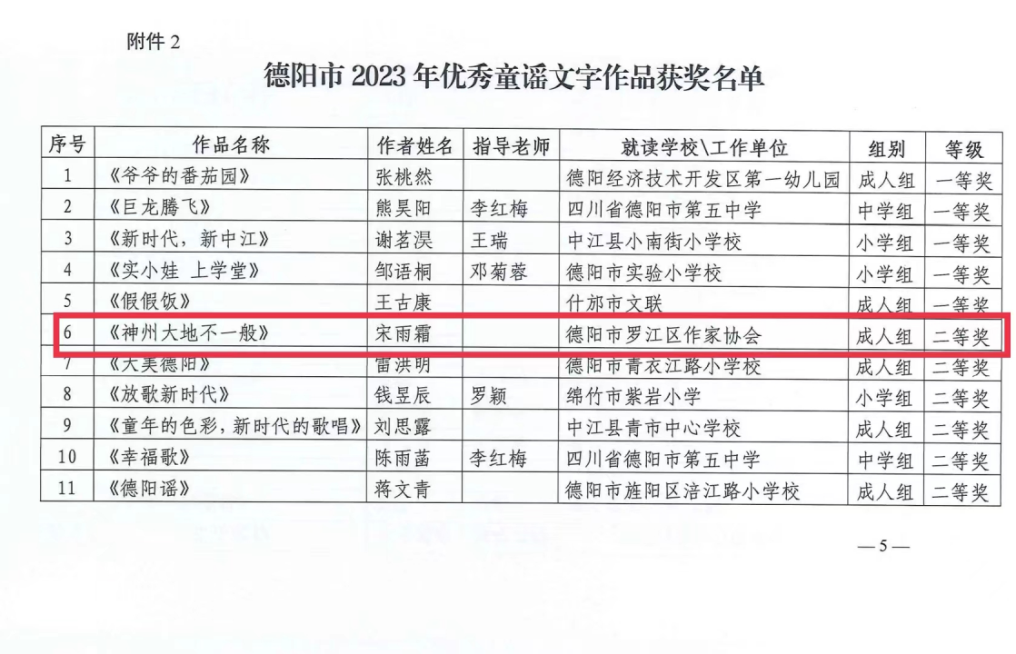 近日由德阳市精神文明建设委员会、德阳市教育局、共青团德阳市委、德阳市妇联、德阳市文联联合开展的年优秀童谣作品传唱活动获奖