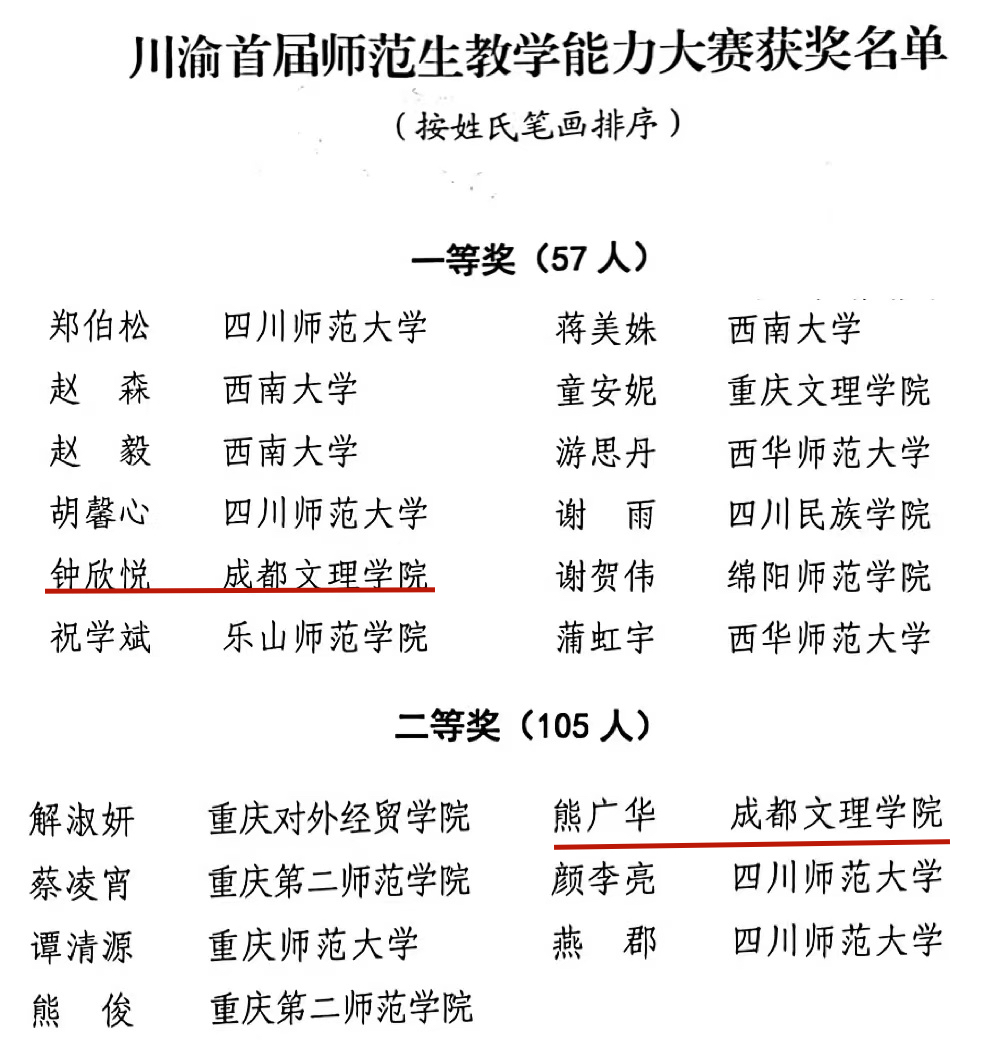 近日由四川省教育厅、重庆市教育委员会主办四川师范大学、长江师范学院承办的川渝首届师范生教学能力大赛公布了比赛结果。由我校