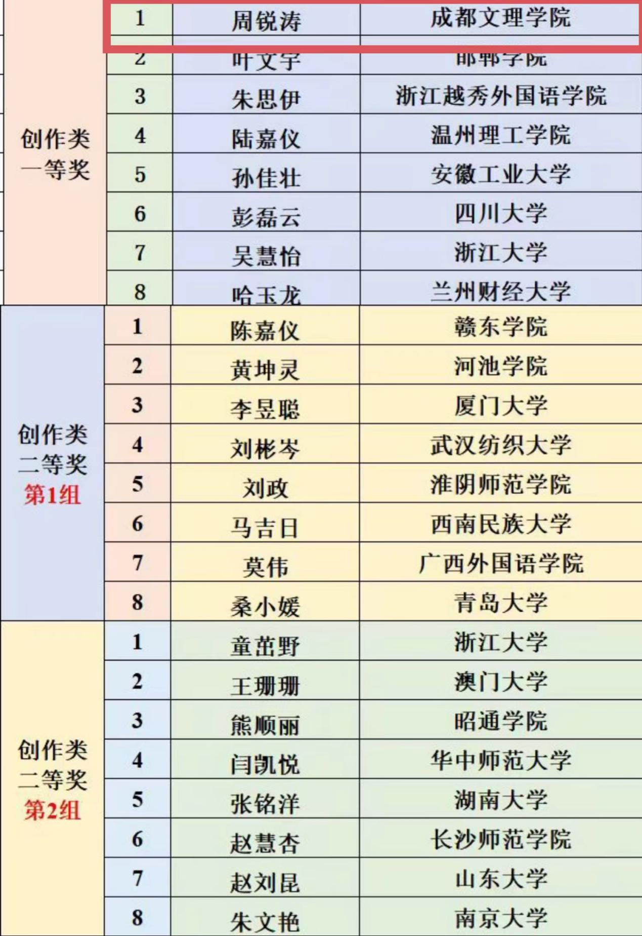 为推动高校诗歌创作与翻译文化建设、提高学生文学素养、培养高等教育人文情怀、促进国际交流与跨文化传播。第六届“求是杯”国际诗歌创作与翻译大赛线下决赛于2024年9月15-16日在浙江大学紫金港校区举行。我校文法学院学子周锐涛同学,在文法学院谢荣萍副教授的指导以及辅导员袁帅的支持下,获第六届“求是杯”国际诗歌创作与翻译大赛国赛创作类一等奖,且为一等奖的首奖。