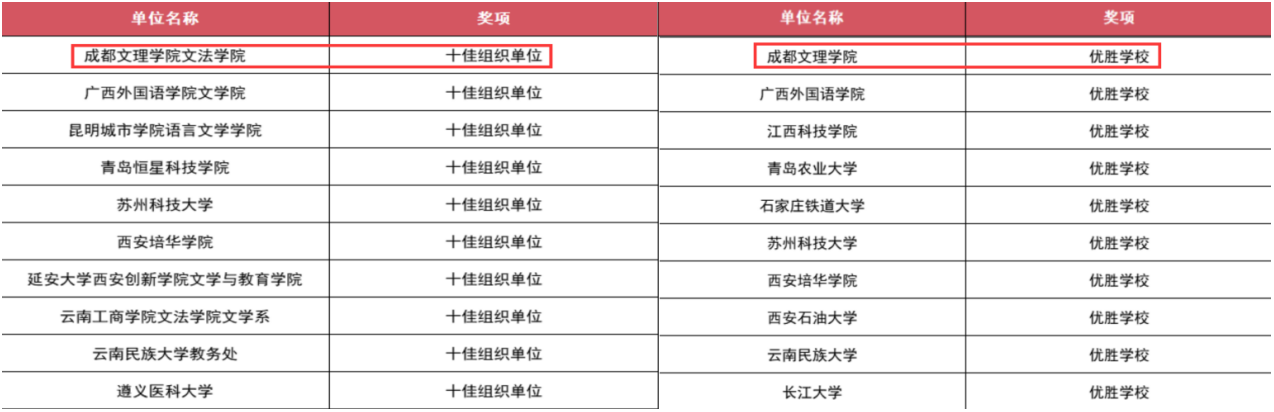 此次获奖不仅充分展示了成都文理学院学生优秀的语言文字运用能力和深厚的文化素养,也充分彰显了成都文理学院在语言文字教学方面的显著成果。未来,学院将继续支持和鼓励学生参加各类竞赛活动,为他们提供更广阔的展示平台,协助他们在未来的发展道路上实现更长远的发展与提升。