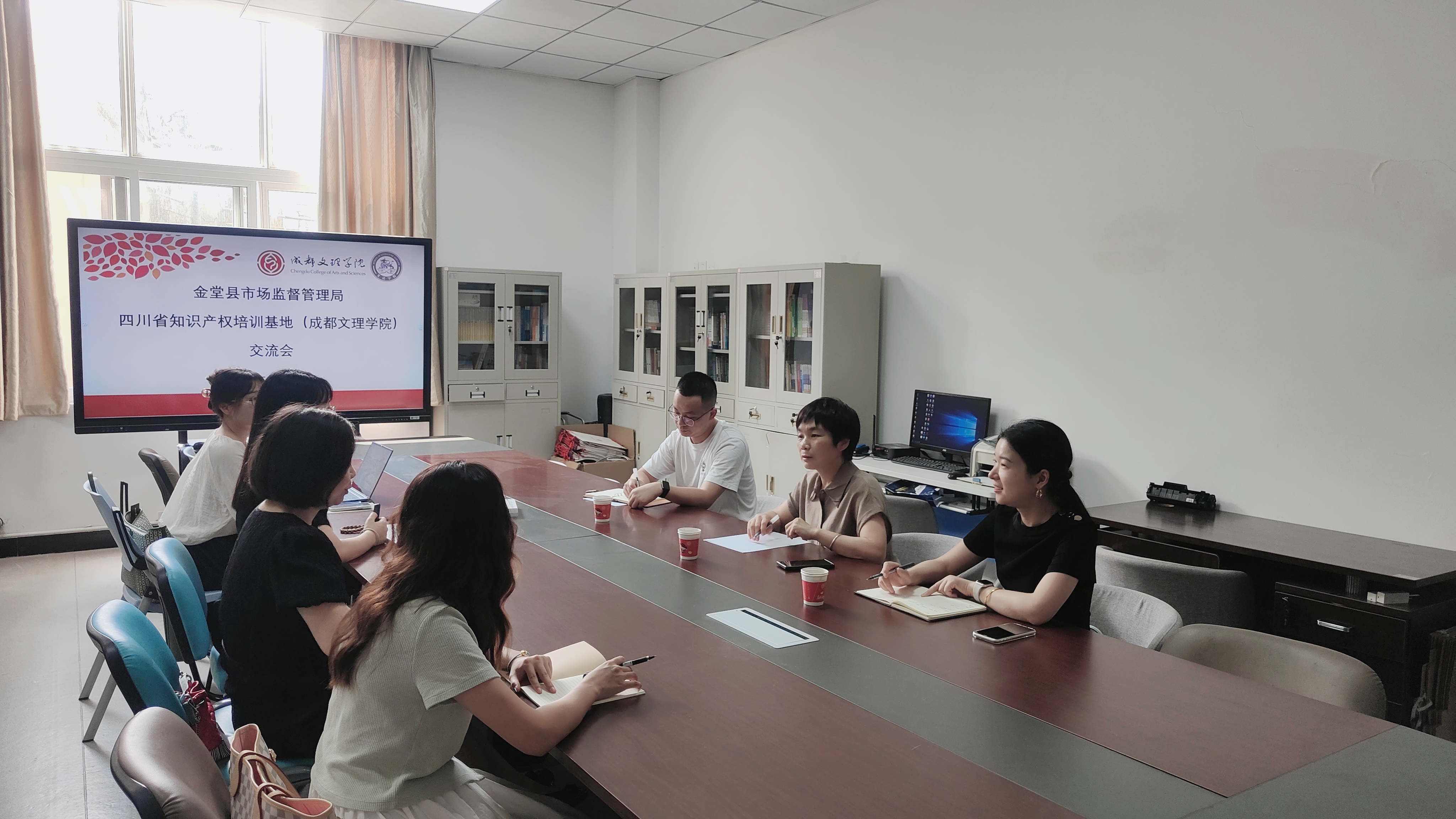 2024年9月12日下午,金堂县市场监管局副局长刘萍率队,带领知识产权室主任汪苗、副主任杨佩一行,莅临四川省知识产权培训(成都文理学院)基地(以下简称“知识产权基地”)进行深入调研与交流。文法学院应用法学教研室主任肖春、知识产权基地负责人牟杰、知识产权基地指导教师赵倩、王舒热情接待了来访嘉宾,并共同参与此次交流活动,会议由肖春老师主持。