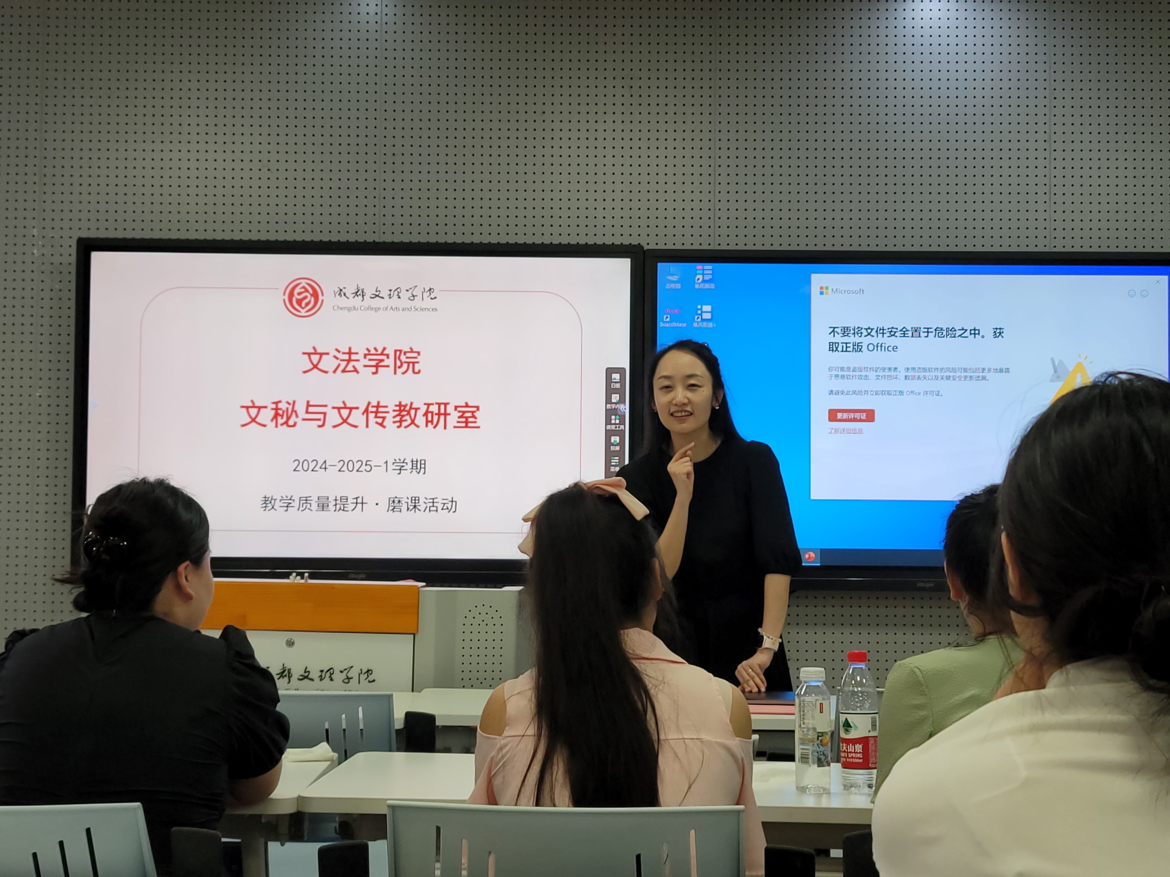 2024 年 9 月 11 日下午16点,文法学院双语文秘与文化传播教研室在 C103教室进行了本学期的首次磨课活动。本次活动旨在贯彻落实《成都文理学院课程建设管理办法》,重视课堂教学,淘汰“水课”,打造“金课”,切实提高人才培养质量,促进教师不断更新教学观念,优化教学过程、教学方式,加强教学研究,形成不断提高教学质量的良性循环。