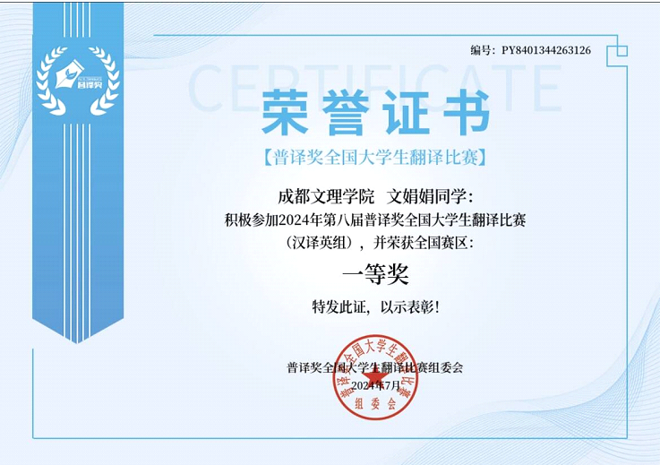近日,第八届“普译奖”全国大学生翻译比赛圆满结束,成都文理学院文法学院学子展现出了他们的综合实力。成都文理学院文法学院学子文娟娟荣获汉译英组全国一等奖。此外,文法学院还囊获了四川赛区一、二、三等奖,并因此荣获优秀协办单位奖。