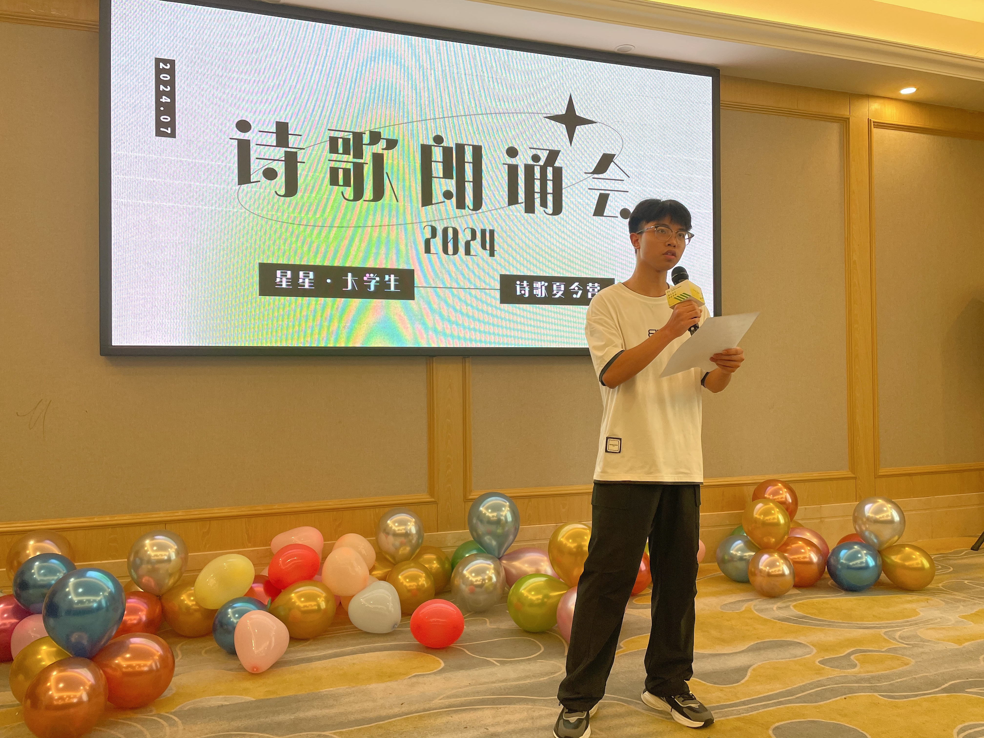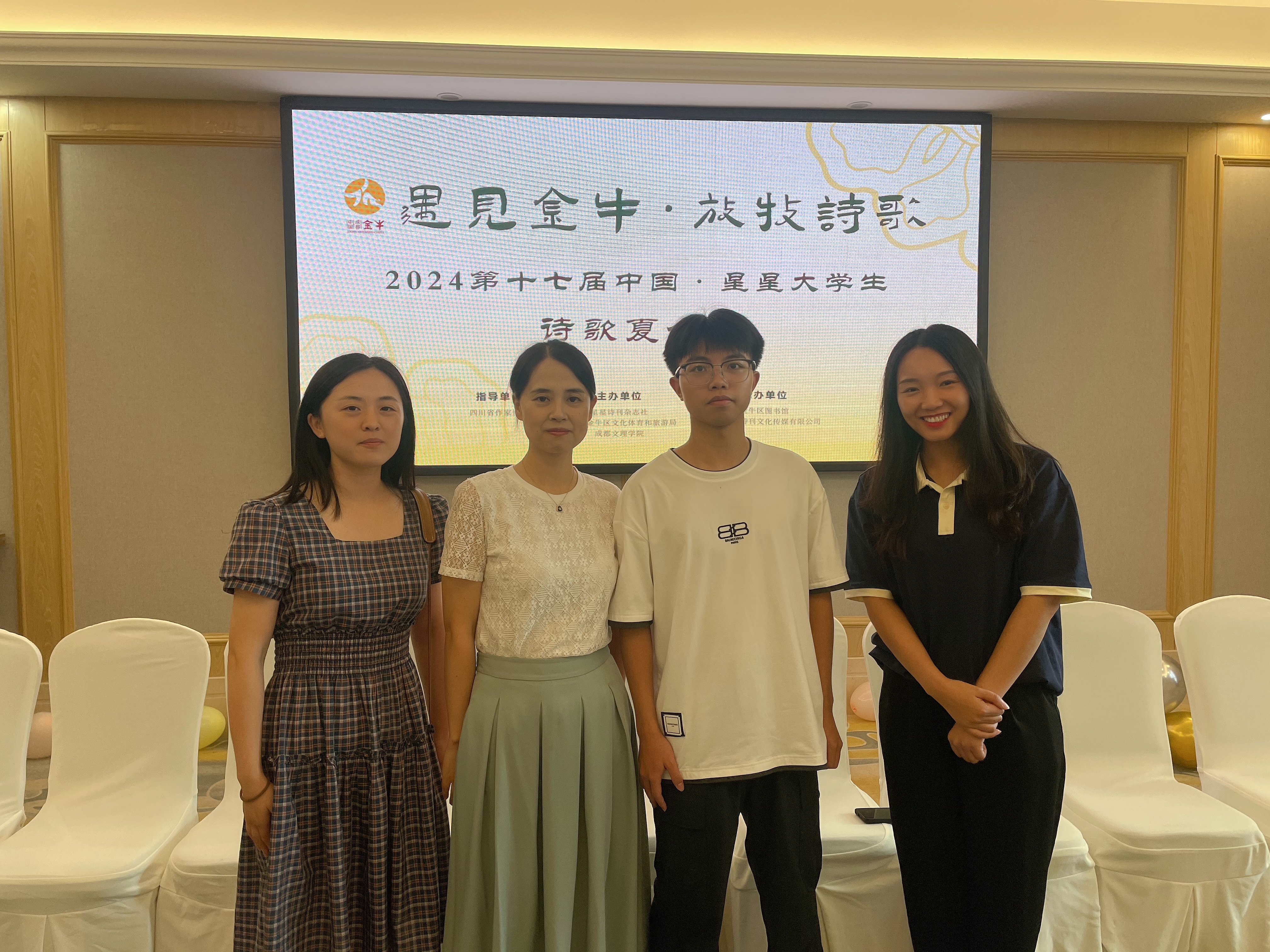 2024年7月22日到7月26日,“遇见金牛,放牧诗歌”第十七届·星星大学生诗歌夏令营活动在成都完满结束,来自国内外23位大学生诗人齐聚一堂,共同完成了一次诗歌的探索之旅。其中文法学院2022级汉语言文学专业201班学生周锐涛参加了本次诗歌夏令营活动,成都文理学院文法学院副院长曹佳丽教授、汉语言文学专业中外文学与文论教研室副主任谢荣萍副教授、汉语言文学专业教师吴昭君作为指导教师全程参加了此次夏令营活动。