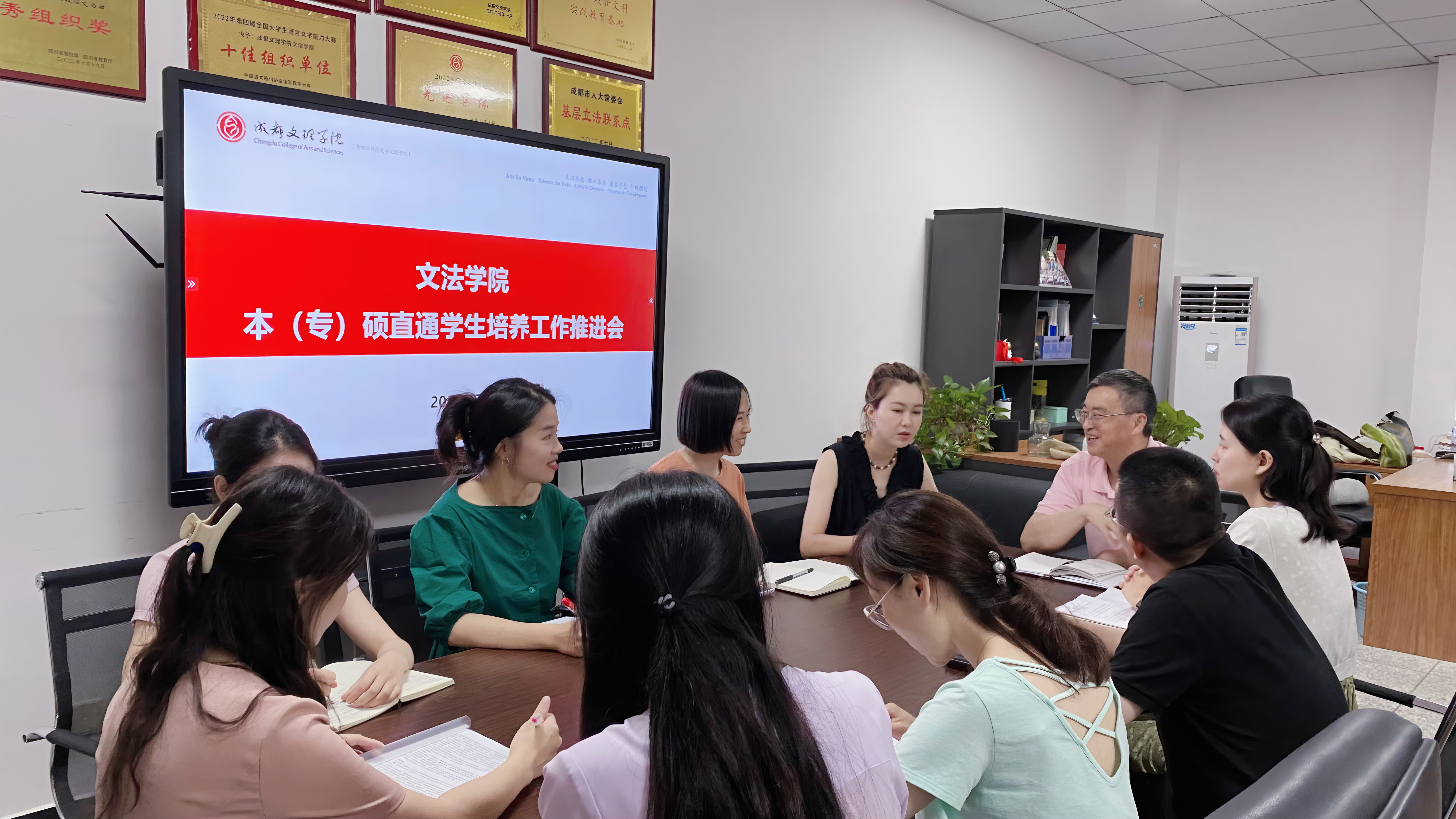 7月10日下午,文法学院召开本(专)硕直通学生培养工作推进会。文法学院院长徐学东、党总支书记陆明烨、副院长曹佳丽、党总支副书记兼学工办主任李明昌、各教研室主任及教务秘书、辅导员代表参会。