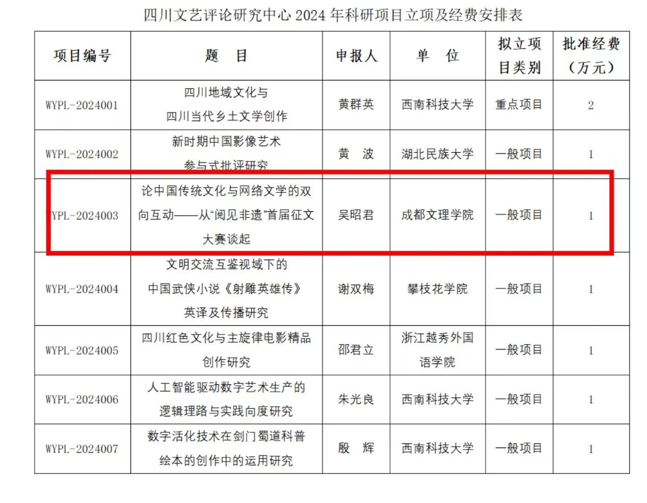 近日,文法学院吴昭君老师,《论巴蜀文化与网络文学的双向互动》课题获四川省教育厅人文社会科学重点研究基地地方文化资源保护与开发研究中心立项、《论中国传统文化与网络文学的双向互动 ——从“阅见非遗”首届征文大赛谈起》课题获四川文艺评论研究中心立项。