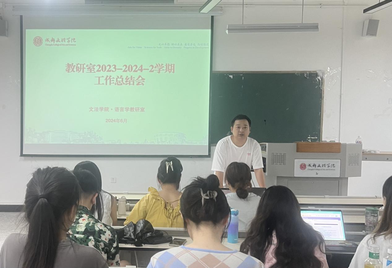 2024年6月21日15:20,文法学院语言学教研室在主教D104召开了2023-2024-2学期工作总结会议。本次会议由语言学教研室副主任项乙朋主持,语言学教研室全体老师出席。