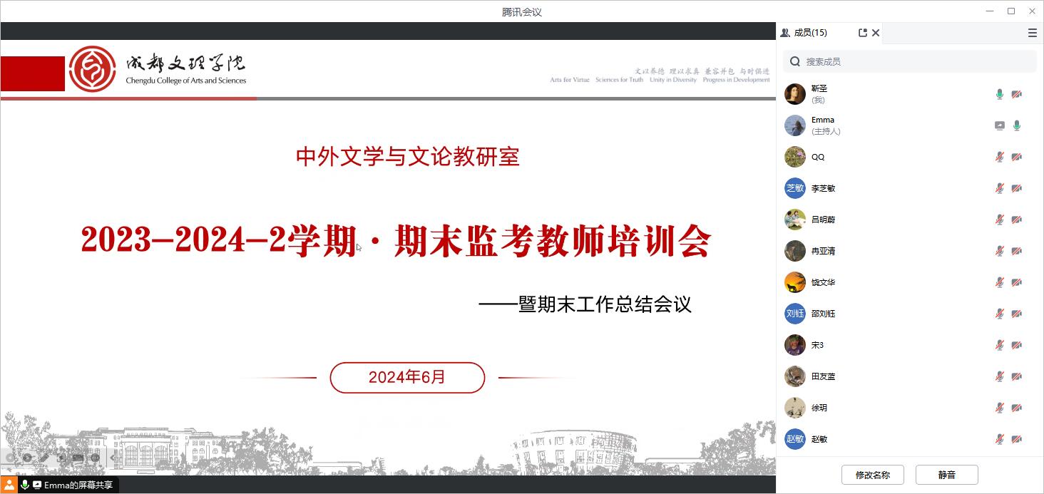 6月22日19:30,文法学院中外文学与文论教研室在腾讯会议室召开2023-2024学年第二学期期末监考教师培训会暨期末工作总结会议。会议由文法学院中外文学与文论教研室副主任刘文主持,中外文学与文论教研室主任蒋瑜、副主任谢荣萍、各教学团队负责人及教师代表参加会议。