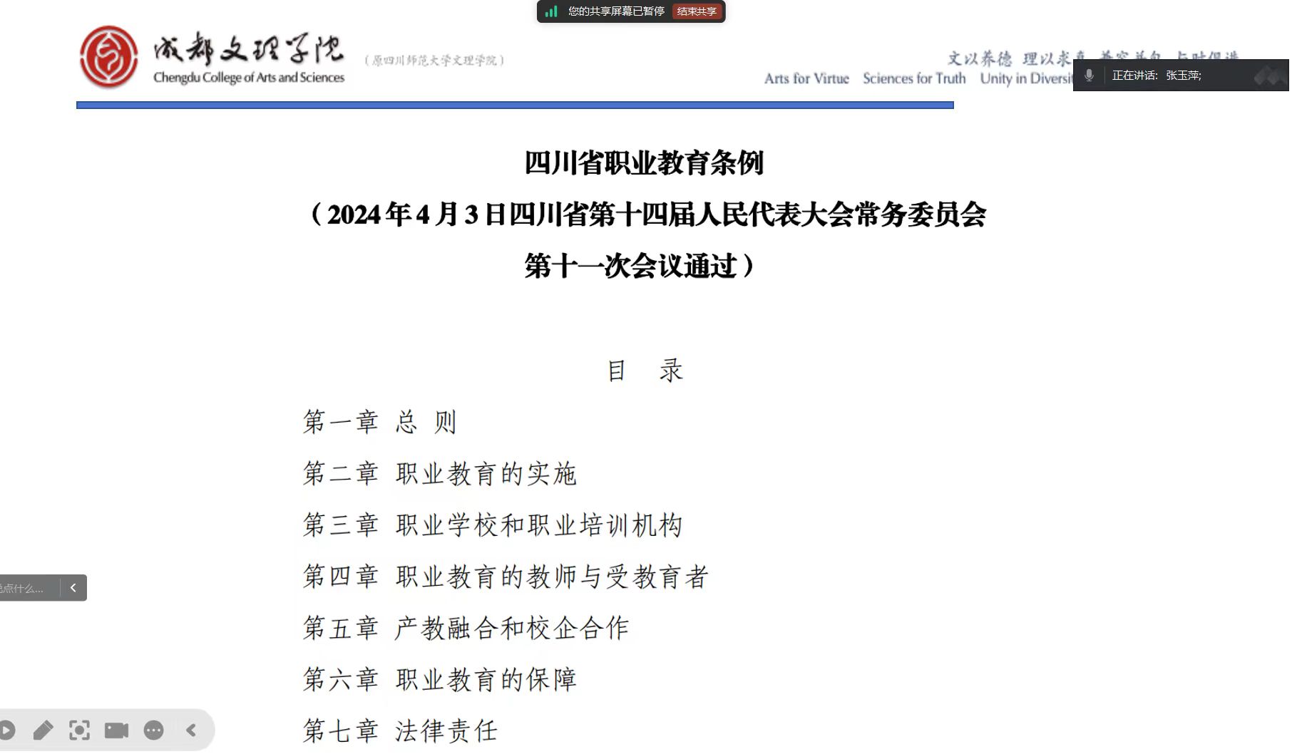 文法学院语文教育教研室于2024年6月18日举行了专题研习会,教研室主任张玉萍主持会议,会议旨在深入研究和理解《四川省职业教育条例》。此次学习充分体现了教研室对职业教育法规的高度重视和积极响应。