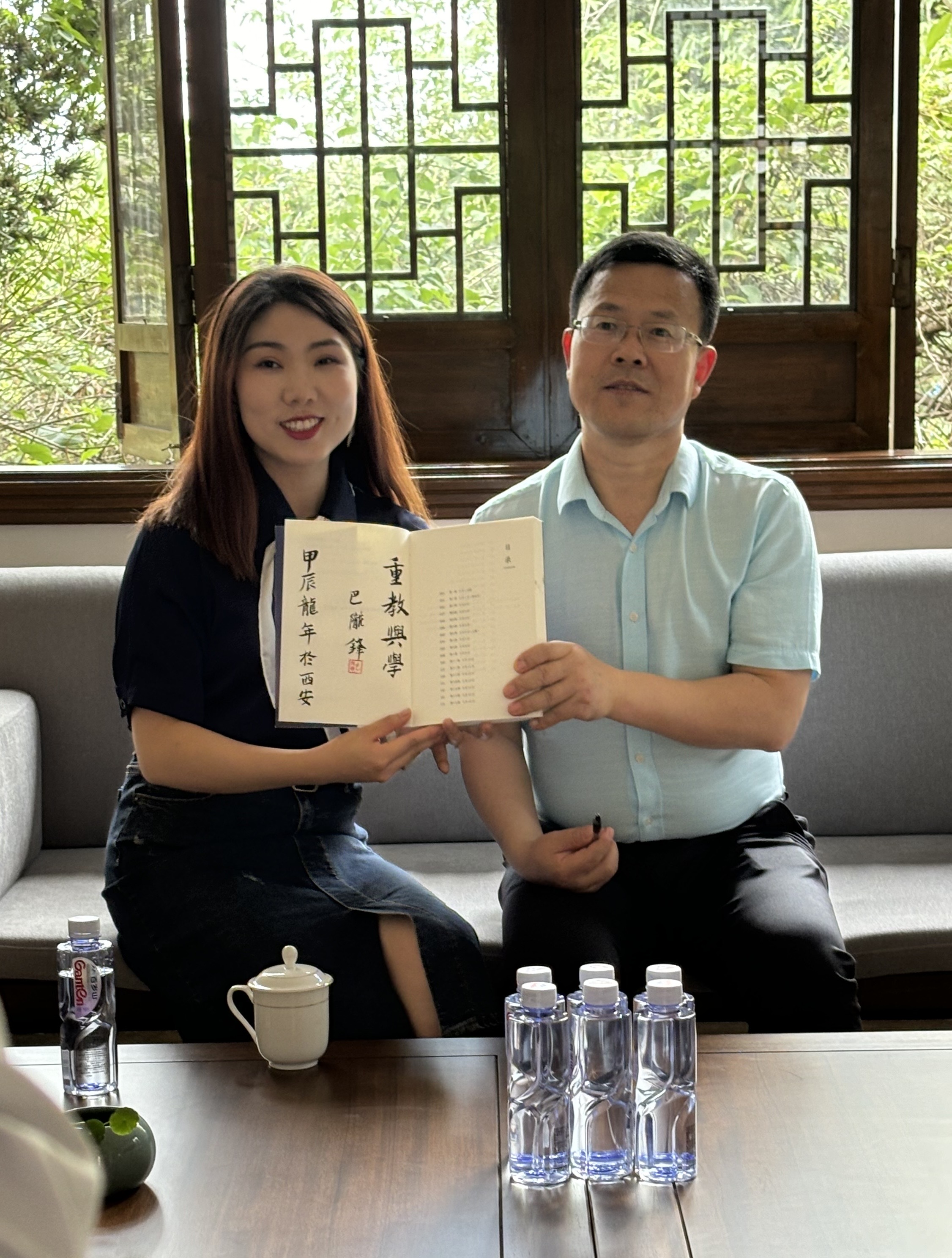 在讲座开始前,巴陇锋老师在赵小爽老师陪同下熟悉文理校园,穿过林荫大道,迎着初夏的阳光,感受文理孕育出的勃勃生机。随后来到我院的弘博书院参观,在一片古色古香中,与在场同学进行交流对话,并签字赠书,合影留念。