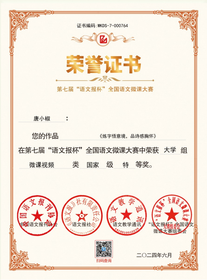 5月31日,第七届“语文报杯”全国语文微课大赛结果公布,文法学院张玉萍老师指导的学生唐小椒、张燕老师指导的学生王建东,获得大学组微课视频项目特等奖。