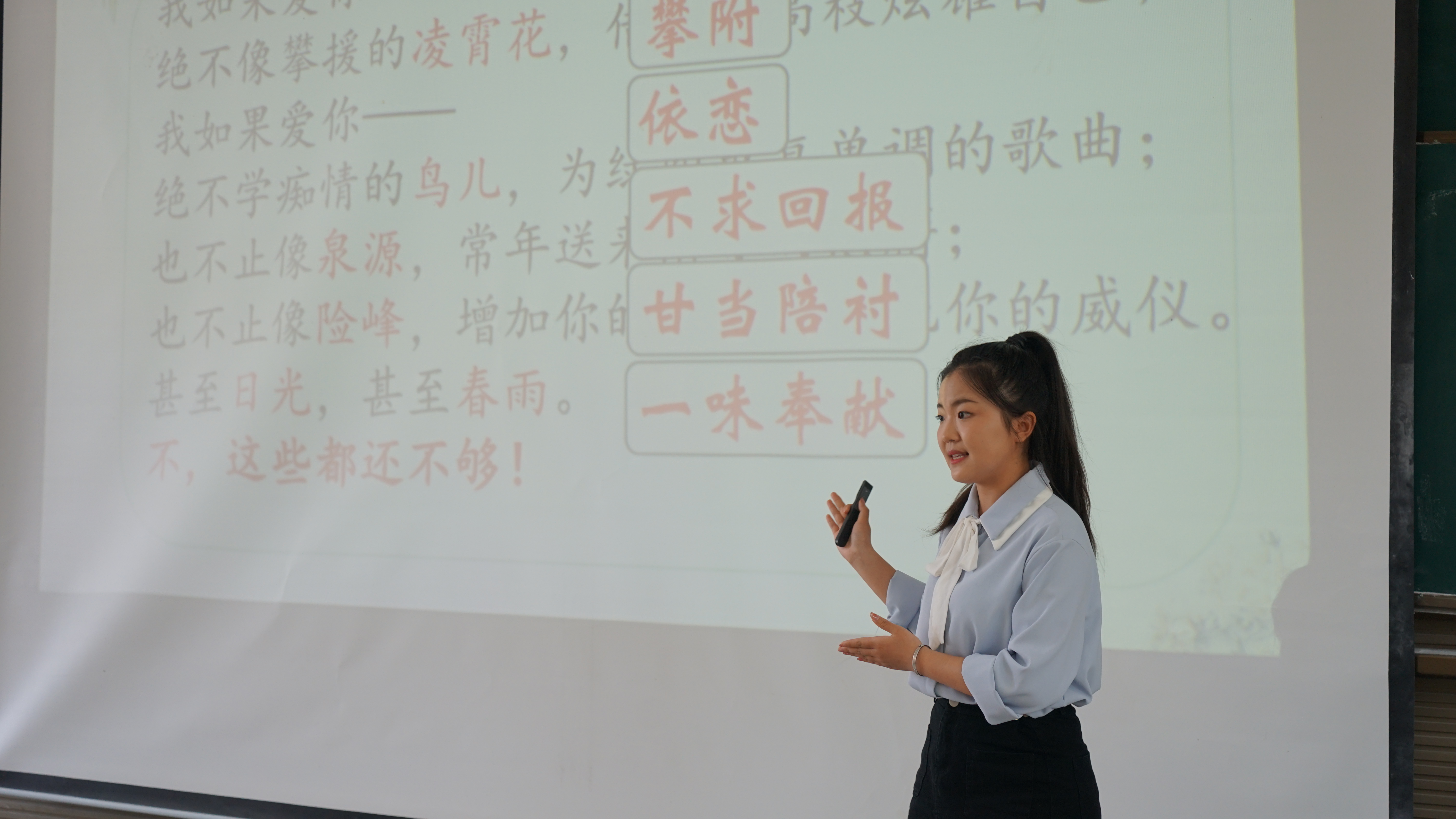 第八届“田家炳”杯全国师范院校师范生教学技能竞赛二等奖获得者马智超展示《致橡树》模拟授课,第二届川渝师范生教学技能竞赛二等奖获得者赖虹夷展示《过松源晨炊漆公店》说课。