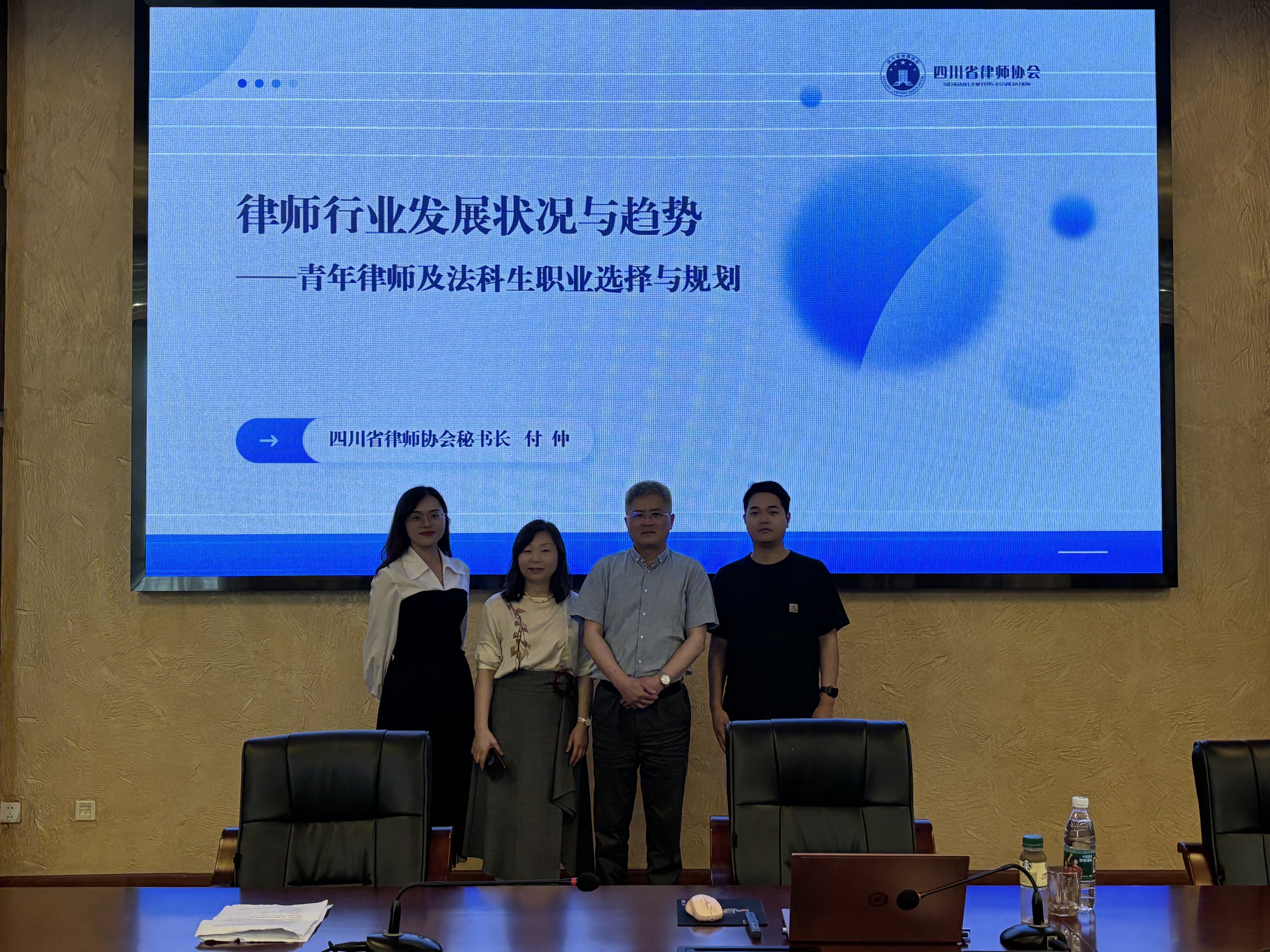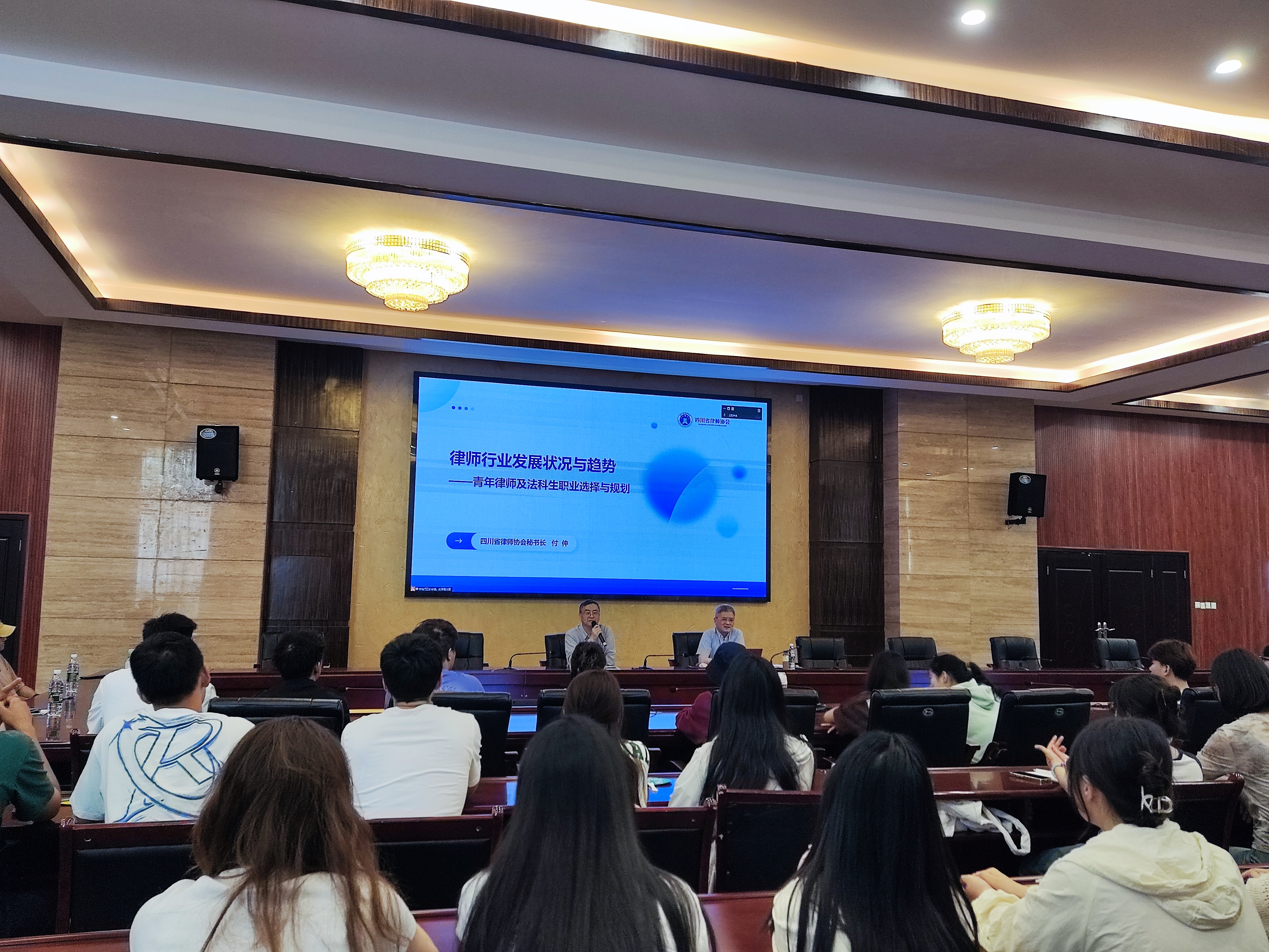 2024年5月9日下午,文法学院邀请四川省律师协会秘书长付仲在学工部211会议厅举行“律师行业发展状况与趋势——青年律师及法科生职业选择与规划”专题讲座。讲座由文法学院院长徐学东教授主持,四川省律师协会办公室副主任杨馨怡、应用法学教研室主任肖春、法学专业教师代表及法学专业部分学生参加讲座。