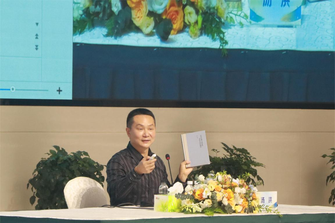 第二场讲座由四川师范大学巴蜀文化与教育研究中心主任、国际中文教育学院院长、成都国学研究会会长汤洪教授主讲。他以《李白“青莲居士”名号再论》为题,首先介绍了李白自号“青莲居士”得名于故乡“青莲乡”的一般误说。考之佛典,李白号“青莲居士”其实源于《维摩诘经》之“青莲”,表明李白尊崇佛教以及向往“维摩诘”之生活模式。《答湖州迦叶司马问白是何人》是李白自答“青莲居士”的最佳自证,李白诗中大量“青莲”佛教意象亦是明证,“青莲居士”是李白内心佛教情怀之外在身份认同。遍考文献,自宋初《太平寰宇记》有李白生彰明县“清廉乡”的记载,此后宋、明文献皆沿袭此种说法,自杨慎《丹铅续录》始有李白生于彰明县“青莲乡”的讹说。