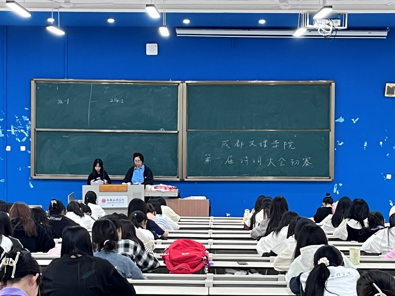 为学习贯彻党的二十大精神,传承和弘扬伟大建党精神,培育和践行社会主义核心价值观,继承和发扬中华优秀传统文化,2024年4月23日下午17:30,由成都文理学院文法学院主办的第一届成都文理学院诗词大会初赛笔试在主教D214、D114举行。本次比赛由中国古代文学课程组张丝丝、张亚靖老师筹备组织。