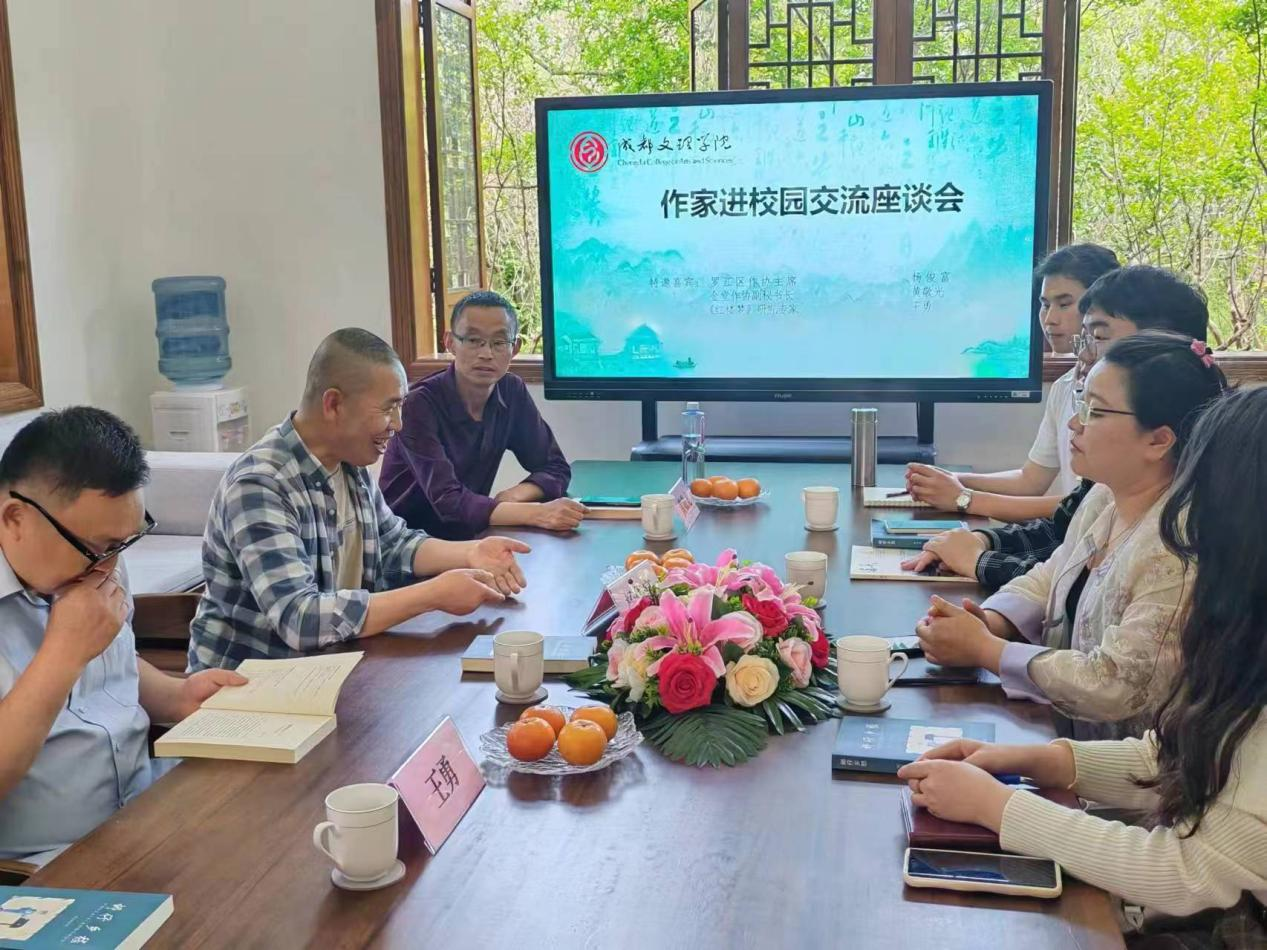 讲座结束后,宋雨霜老师带领学生邀请杨俊富一行前往弘博书院,书院参观结束后进行“作家进校园”文学座谈会。会上,师生就文学素养提升、写作技巧等继续向杨俊富、黄敬光、王勇请教,并受到鼓励,收获中肯的发展建议。