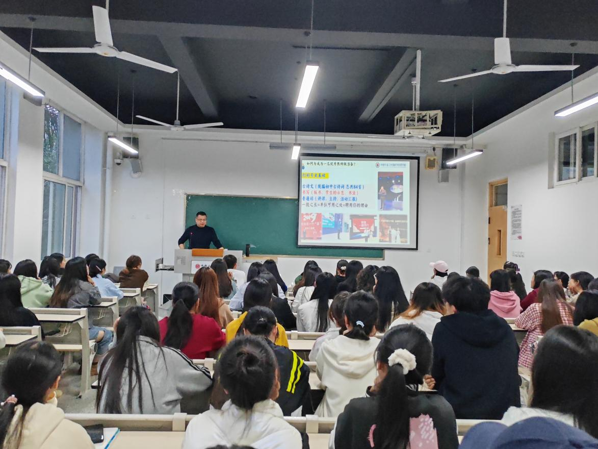 4月10日19时,“以赛促学,以赛促练——汉语言文学师范生教学技能提升重要路径”主题讲座在D209开展,此次讲座由成都温江嘉祥外国语学校段华明老师主讲。