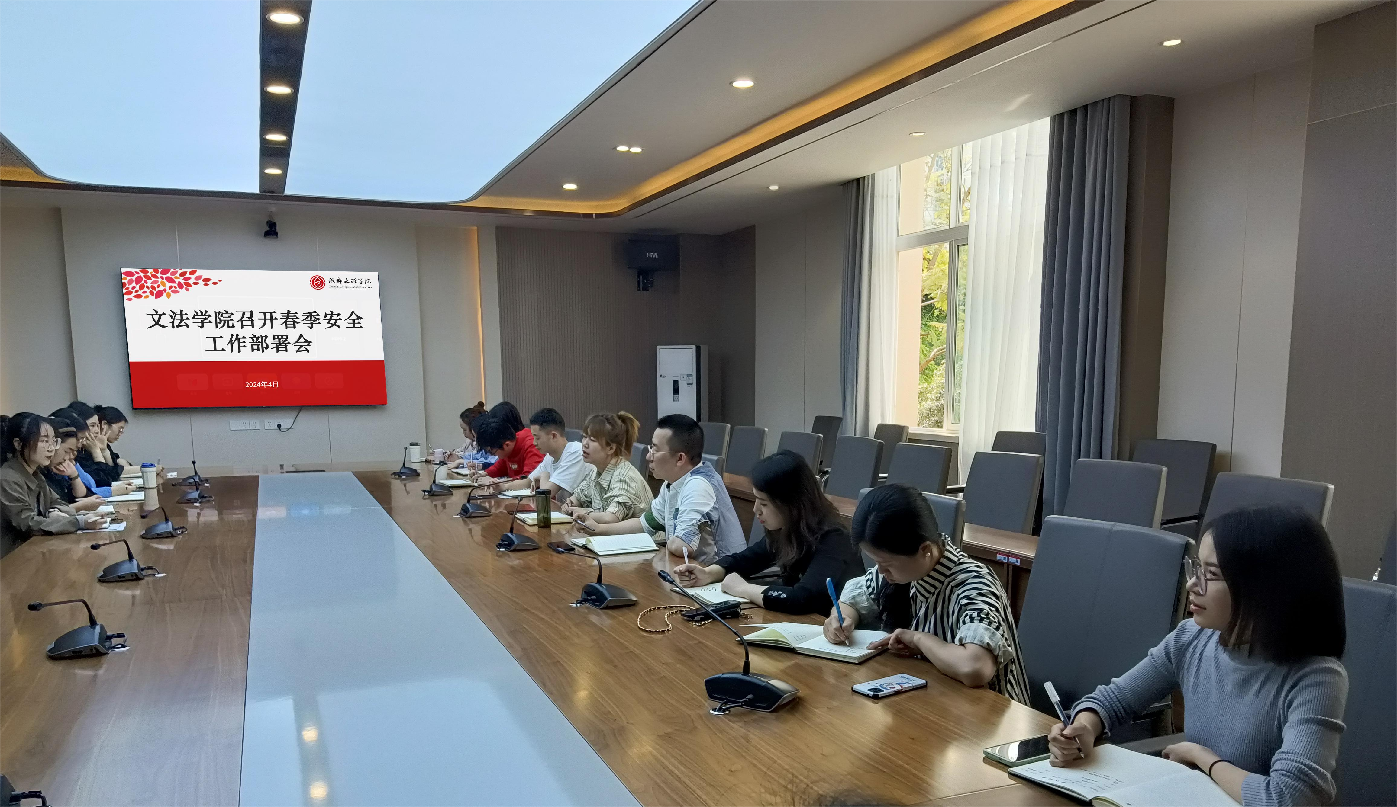 随着清明假期的临近,为切实做好节日期间的安全防范工作,提高学生的安全意识,文法学院于4月1日在行政楼第二会议室召开春季学期安全工作部署会。文法学院党总支书记陆明烨、党总支副书记兼学工办主任李明昌及全体辅导员参加会议。