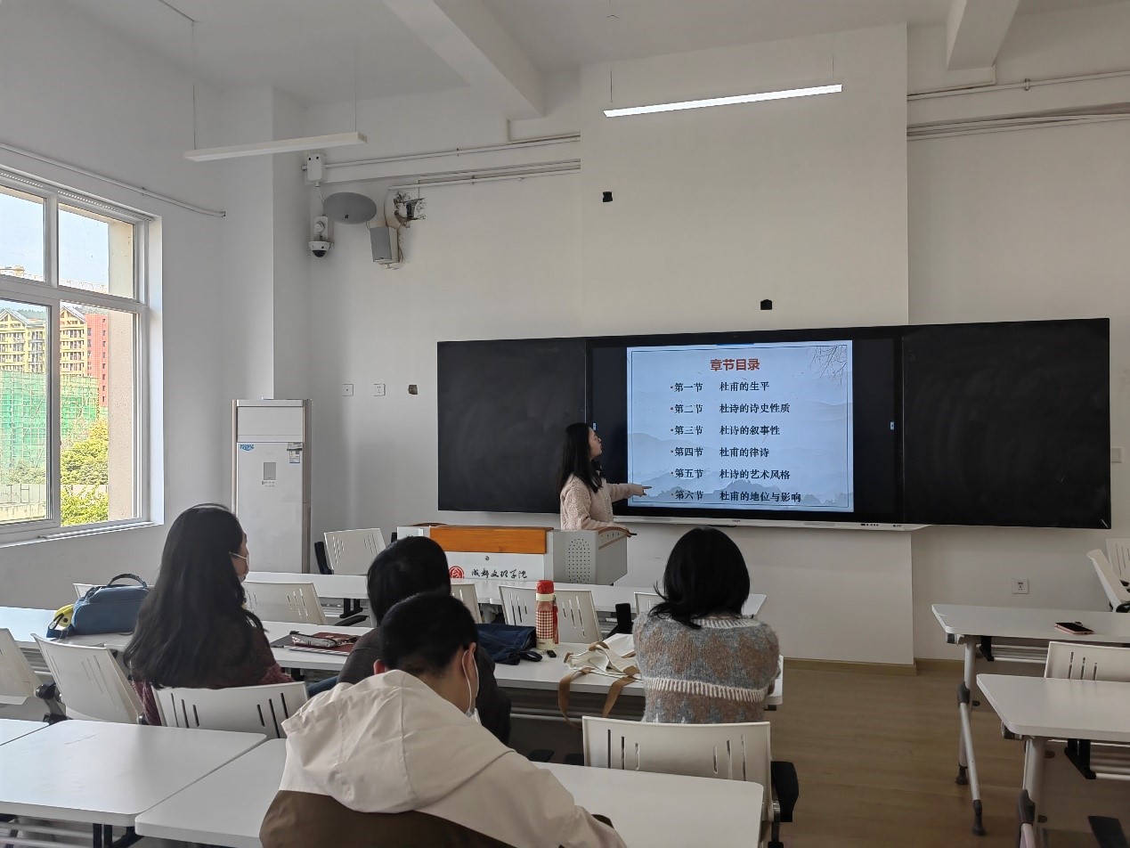 中国古代文学大三课程团队谢玥老师从杜甫家世入手,讲解了杜甫家族中“奉儒守官”的传统和“诗是吾家事”的传统对其立身行事和文学创作的影响,结合具体诗歌对杜甫律诗高超的技巧进行分析;张丝丝老师以杜甫“沉郁顿挫”的诗风和律诗的创作为磨课内容,进行启发式教学;张亚靖老师讲解了杜诗的思想内容,准备充分,将课程思政元素融入到了教学之中。