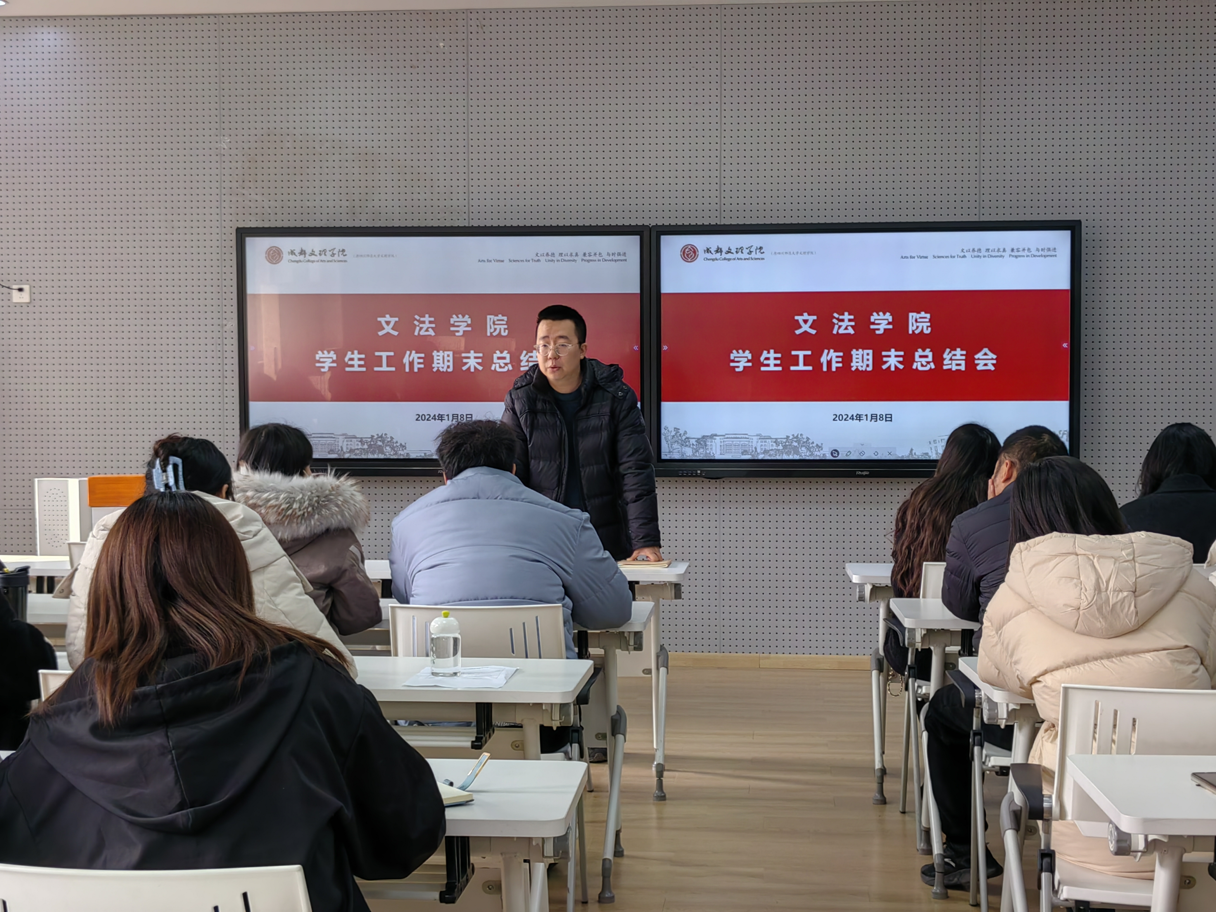 1月8日下午,文法学院在教学楼C401召开2023年度学生工作总结会议。文法学院党总支书记陆明烨、党总支副书记兼学工办主任李明昌及全体辅导员参会,会议由李明昌主持。