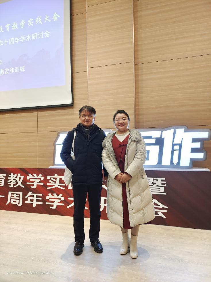 宋雨霜老师就师范生写作教学中儿童文学元素的渗透与实践和上海大学博士导师谭旭东教授作了交流,谭教授对文法学院师范生写作教学提了建议,并推荐相关的教学资源。宋雨霜老师向此次大会提交了论文《乡土情怀融入师范生写作教学的策略研究》,并获评优秀论文奖。