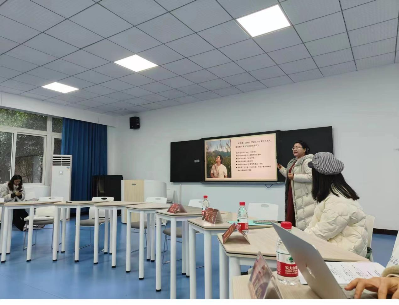 会场,成都文理学院学校LOGO旗帜与其他高校的旗帜为会议营造氛围。在分论坛四“创意写作教学模式探讨”中,文法学院语文教育教研室写作课程负责人宋雨霜老师作了《创意写作视域下师范生写作教学的实践》主题发言。介绍学校、学院相关情况后,宋雨霜重点介绍了文法学院写作课的建设情况,突出“以赛促学”“第二课堂”“多平台促进发表意识”等教学模式。结合地方性应用型高校的特点,宋雨霜老师提出师范生写作教学要注意突出地域文化的挖掘与写作,培养学生地方性文化资源课程开发的意识与能力。“今天他们是学生,未来他们是基础教育的主力军,创意思维与创意写作素养可以支撑师范生们走得更扎实、更长远。宋老师的观点很契合地方院校教学实际。”宋雨霜老师的发言获得论坛评议人的赞许。