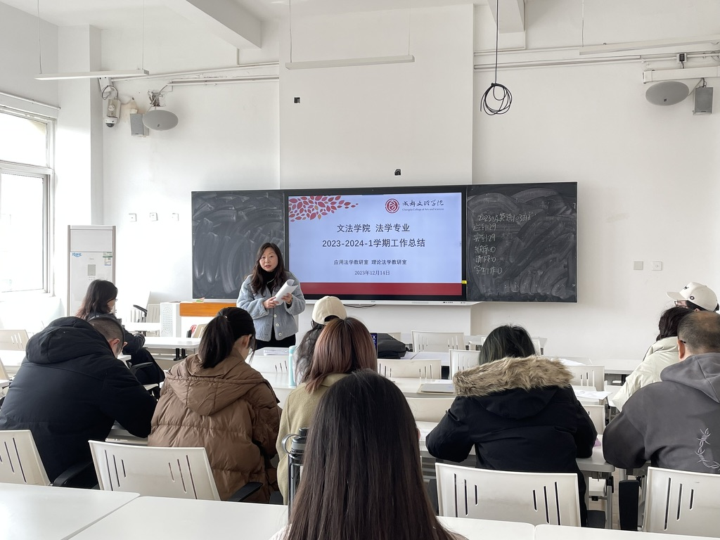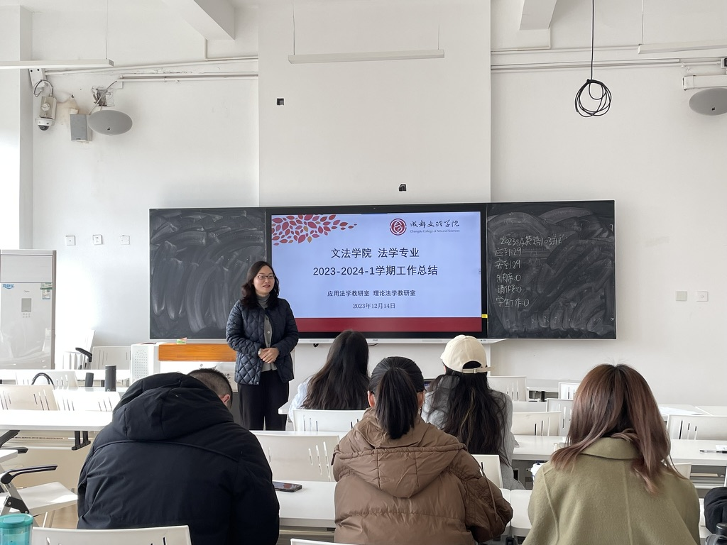 2023年12月14日下午,文法学院法学专业在主教学楼C409召开了2023年度工作总结会议。会议由应用法学教研室主任肖春主持,徐学东院长出席会议,全体法学教师参加会议。
