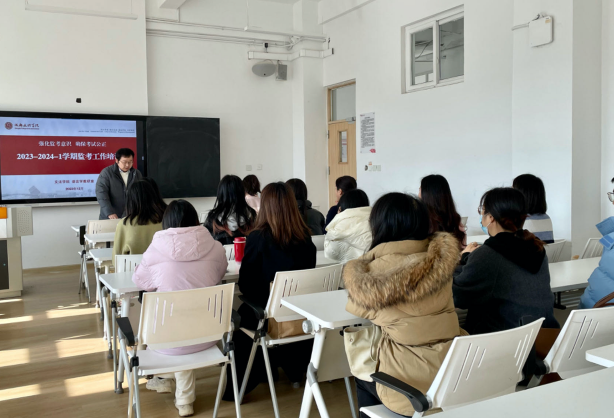 为保证考试工作顺利进行,严肃考风考纪,促进优良学风的形成,2023年12月14日下午13:40,文法学院语言学教研室在行政楼C413召开了2023-2024学年第一学期监考工作培训会。语言学教研室的教师参加了会议。