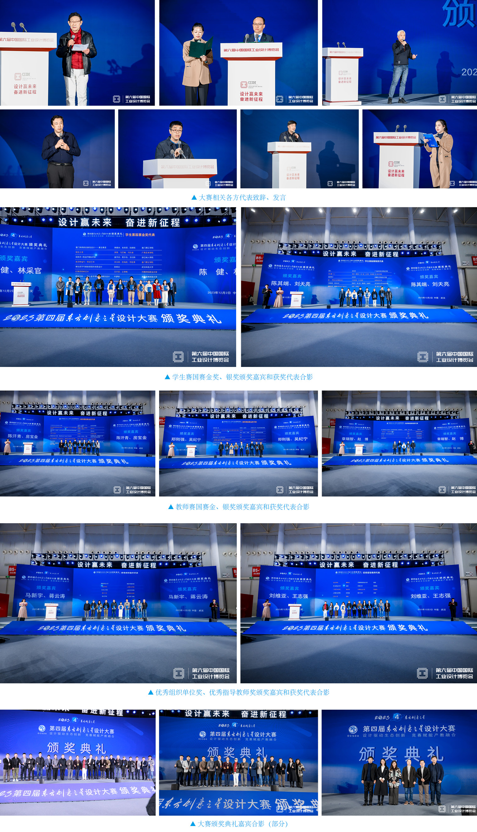 工业和信息化部国际经济技术合作中心、北京工信国际科技发展有公司等单位相关领导,东方创意之星大赛评委会执行主席、上海市原创设计领衔大师刘维亚致辞;海外赛区代表东明大学秘书长、中韩文化艺术交流研究院院长、教授임채관(林采官),国赛终评专家代表、CDS中国设计师沙龙执行主席蒋云涛,分赛区代表天津大学副教授王鹤作为代表分别发言。大赛专家代表、相关领导作为颁奖嘉宾分别为优秀组织单位奖,优秀指导教师奖,教师赛国赛金奖、银奖获奖代表颁奖。