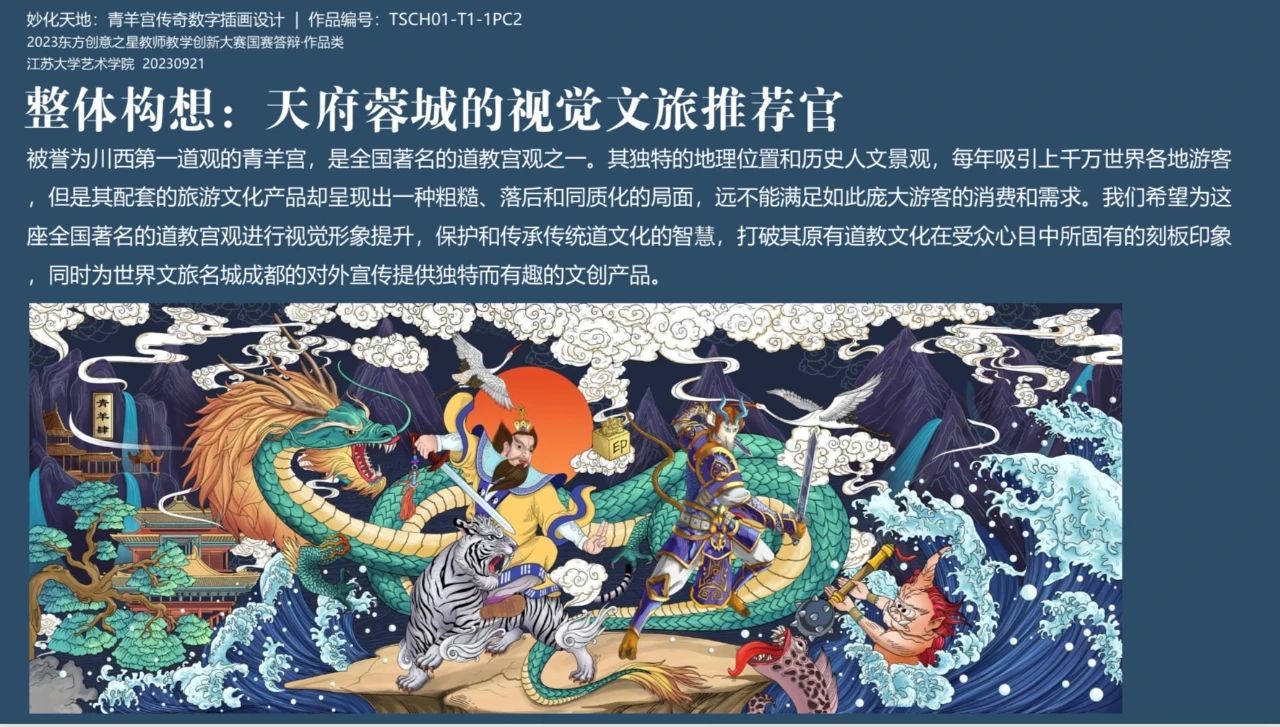 2023年12月2日,第四届东方创意之星大赛颁奖典礼在武汉国际博览中心B5馆主论坛主论坛会场举办。本次大赛的教师赛分为院校教师组、企业导师组和博士组,特设四大类别:作品类、论著类、课程类、项目类。我院刘妤宸老师与其导师李俊涛教授的跨媒体数字系列原创作品《妙化天地:青羊宫传奇系列数字插画》荣获全国总决赛金奖,并入选《第四届东方创意之星设计大赛优秀作品集》。该系列作品还入选中国设计师沙龙主办的“龙年艺术设计展”。