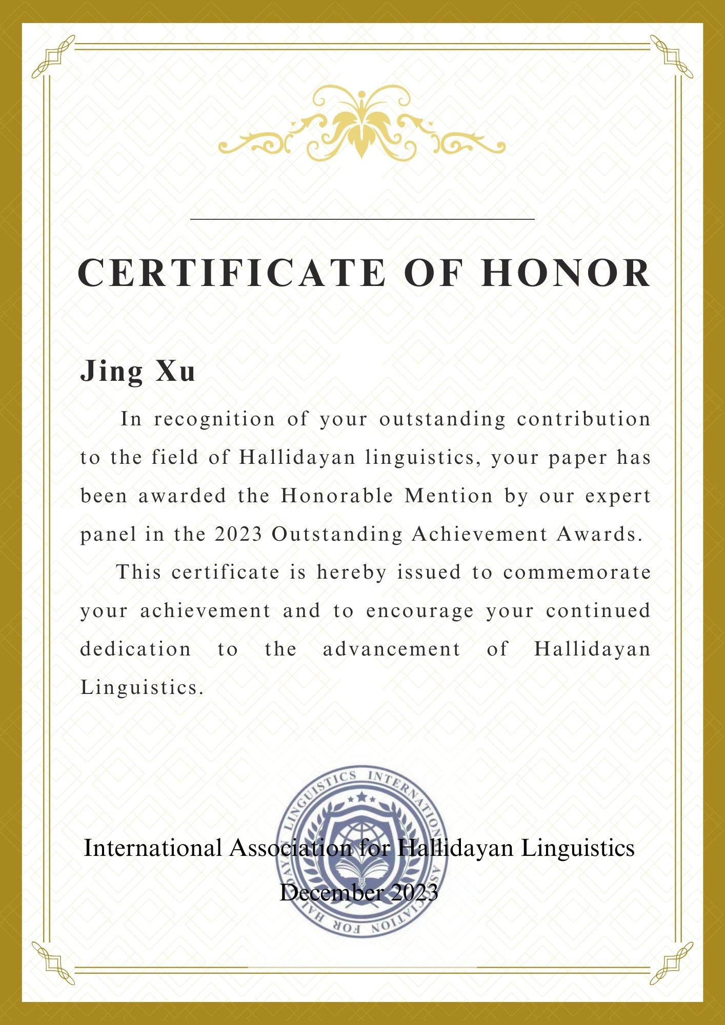 “国际韩礼德研究会”由澳大利亚学者与中国学者于2019年在澳大利亚悉尼联合注册创办,旨在于弘扬世界著名语言学家韩礼德(M.A.K. Halliday)的学术遗产,推进世界范围的语言学术活动。2023年10月研究会面向国内外广泛征集2023年度韩礼德研究优秀成果,征文范围涉及系统功能语言学、话语分析、文体学、社会符号学、语料库语言学、应用语言学、汉语研究、批评语言学等等。参评内容包括但不限于论文、论著、译著等成果形式,约有百余件作品参评,至11月底产生评选结果。“国际韩礼德研究会”于2023年12月1日公布了2023年度研究会优秀学术成果奖。经专家评定,共评出特等奖、一等奖、二等奖、三等奖和优胜奖若干。