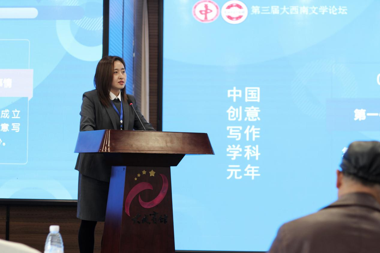 在论坛第一分会场,相晓冬老师针对论文《创意写作视阈下巴蜀文化符号在大西南文学创作中的运用研究》的研究思路、研究内容、研究意义、创新点等进行阐述,并指出“创意写作力求一切创作活动的创新、独特,而巴蜀文化符号的融入必将为大西南地区的文学创意写作拓展一种新的发展思路,注入新的发展活力。”发言得到了在场与会专家的认可与肯定,评议专家指出,“深而神秘”的巴蜀文化历史悠久、根基深厚,具有独特的地域魅力,在创意写作学科背景之下,将其与现代、后现代感的文学内容相结合,为大西南文学的发展注入新动能、开拓新路径,提供了一种可能性,具有一定的研究价值。